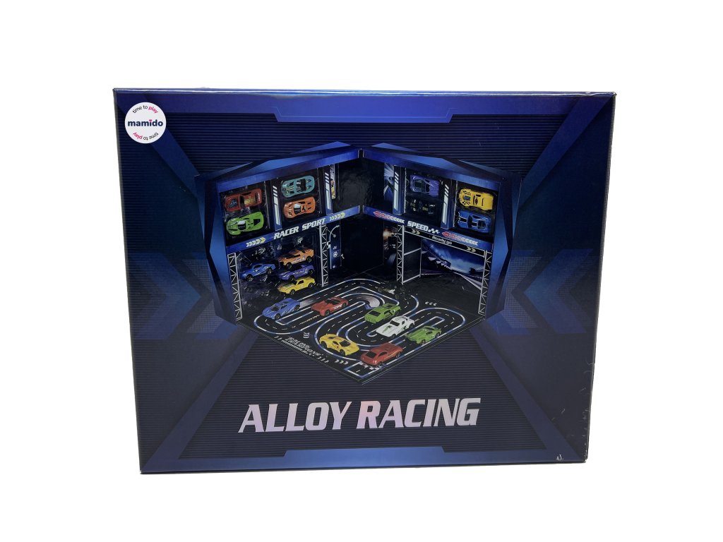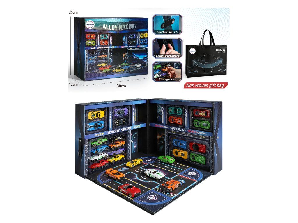 Stílusos fém sportautó készlet verseny garázs tárolóval. A fogantyús bőrönd kialakítás hordozható garázsként szolgál, belsejében versenypálya + parkolóhelyek az autók kiállításához. A gyerekek így nemcsak játszhatnak, hanem az autókat is vissza tudják tenni a dobozba.