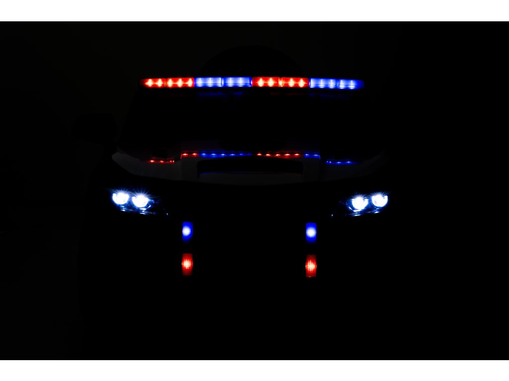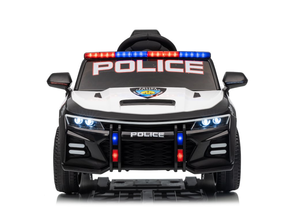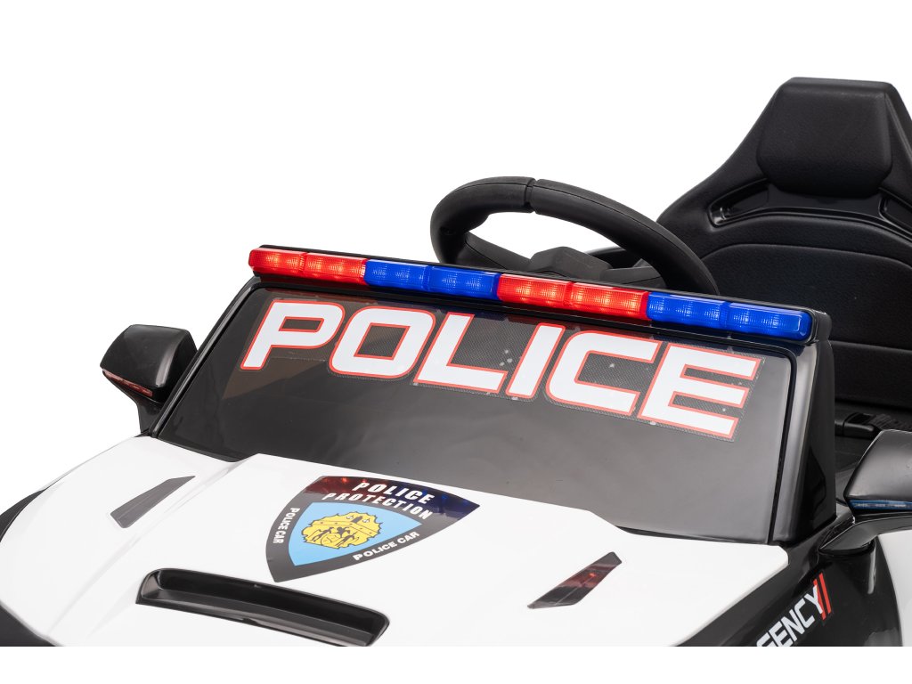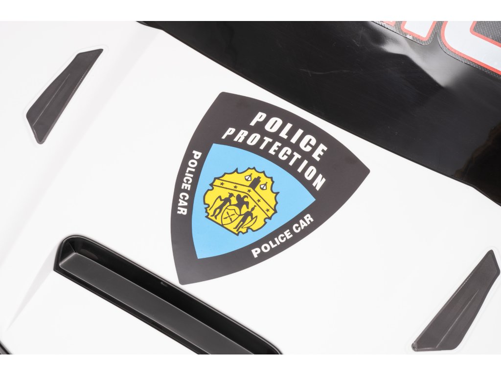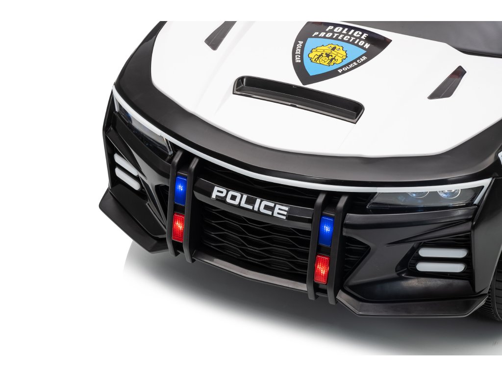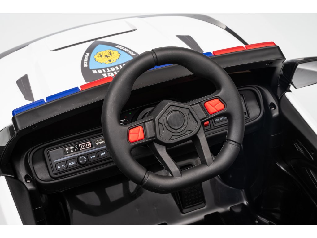 Az autó műbőrrel bevont üléssel, biztonsági övvel és nyitható ajtókkal van felszerelve. A LED lámpák elöl, a kék-piros rendőrségi jelzőfények és a valósághű hangok egy igazi bevetési jármű benyomását keltik. A Bluetooth, USB és MP3 csatlakozással ellátott multimédiás panelnek köszönhetően a kis sofőrök kedvenc zenéjüket hallgathatják vezetés közben.