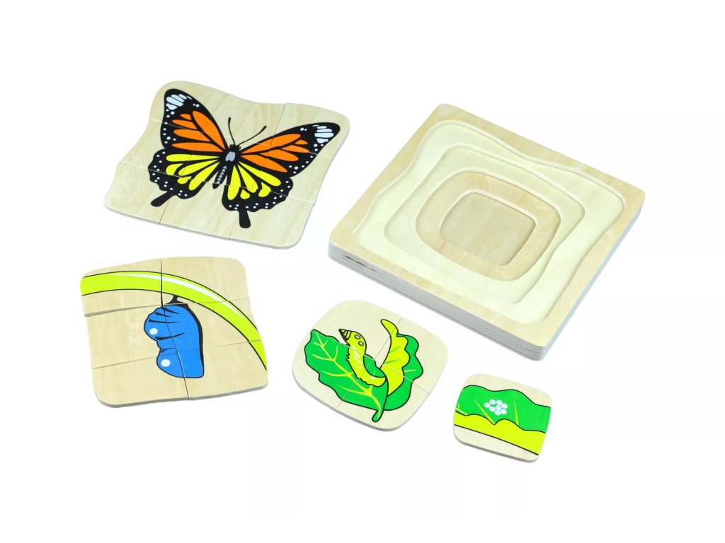 Montessori eszköz, amely rétegekben ábrázolja a pillangó fejlődését. Alkalmas a kisgyermekek alapvető készségeinek fejlesztésére.
