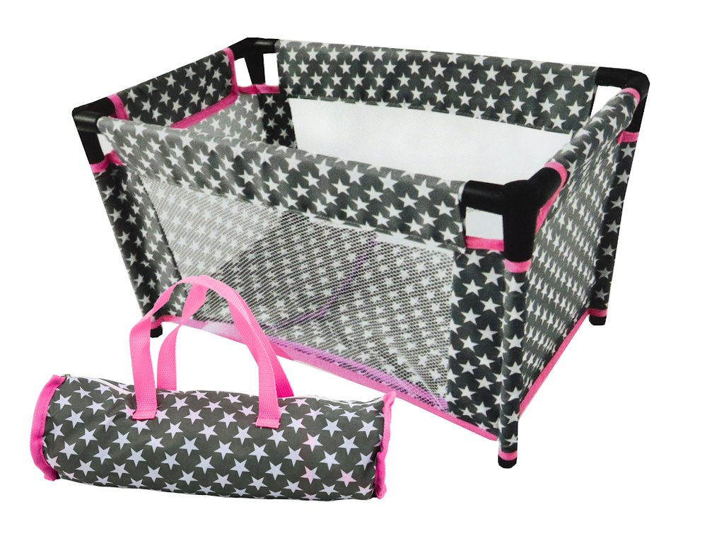 A keret alumínium csövekből készül, fekete műanyag csatlakozásokkal. A készlethez tartozik egy takaró és egy párna . Az egész kiságy és az elemek szürke színűek, fehér csillagokkal és rózsaszín elemekkel. Könnyen kihajtható és hordozható táskában tárolható, így mindig magunknál lehet.