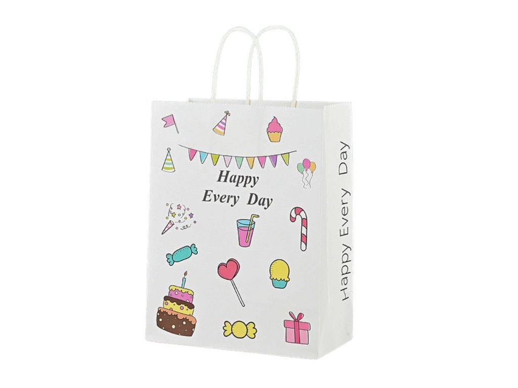 A 20 cm x 15 cm-es papírzacskó ideális apró ajándékok csomagolására. Színes grafikával díszített, és a "Happy Every Day" feliratot viseli, ami tökéletes választássá teszi különféle alkalmakra, például születésnapokra, bulikra vagy szeretteivel való összejövetelekre.