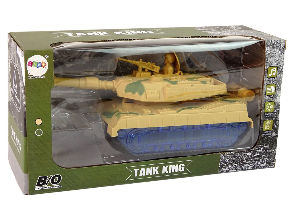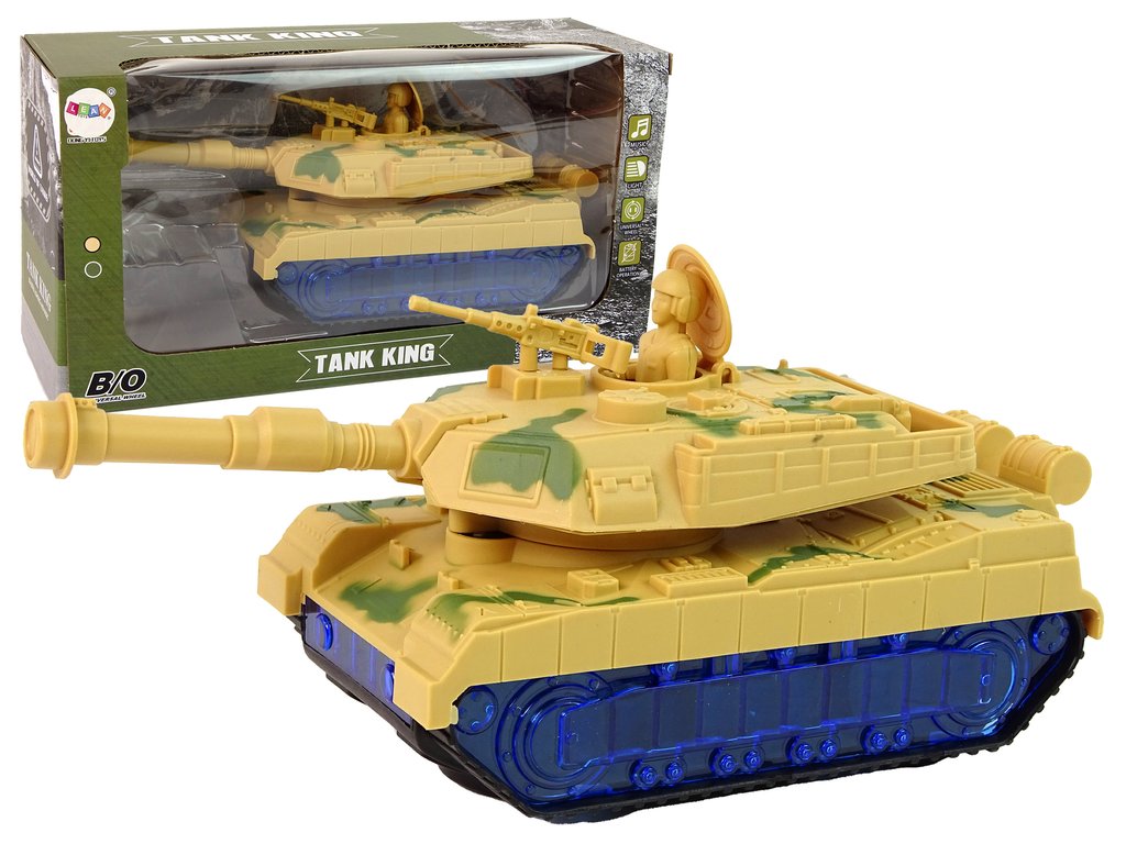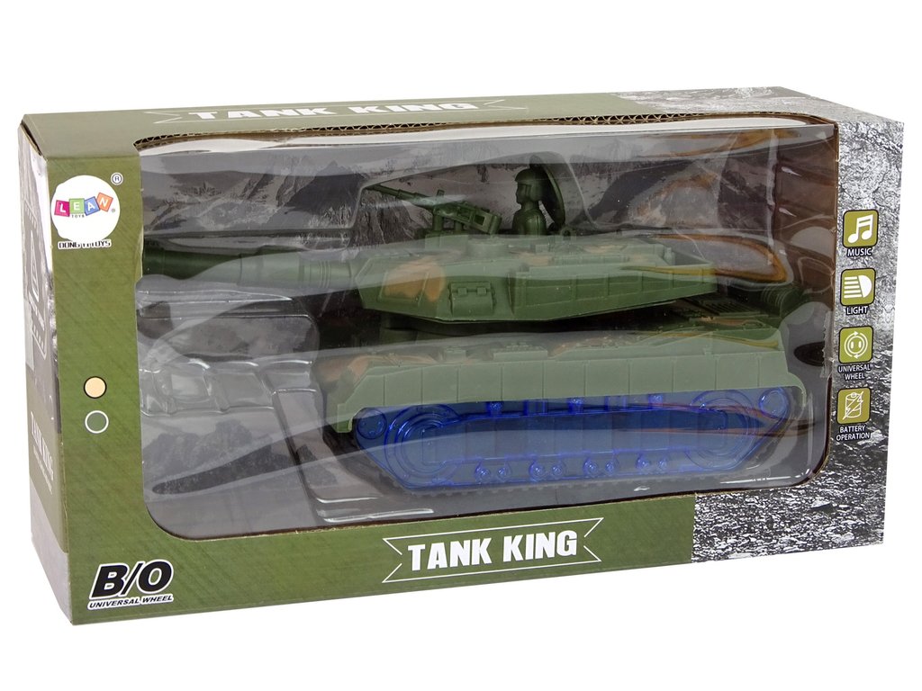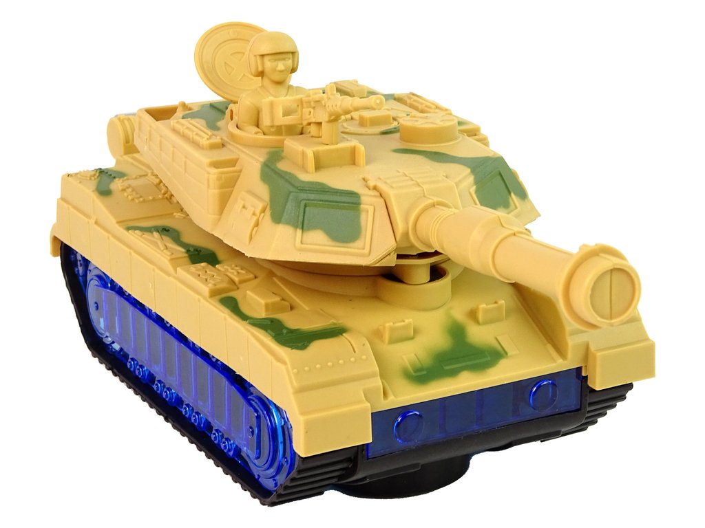 A tank háborús festékkel és lánctalpas abroncsokkal van ellátva, hogy utánozza egy igazi tank menetét. A meglepetés az, hogy a kerekek kéken világítanak LED-ekkel. Bekapcsoláskor az ágyú egyik oldalról a másikra forog, és motorhangok hallatszanak a háttérben. Minden részlete megegyezik a valódi járművel.