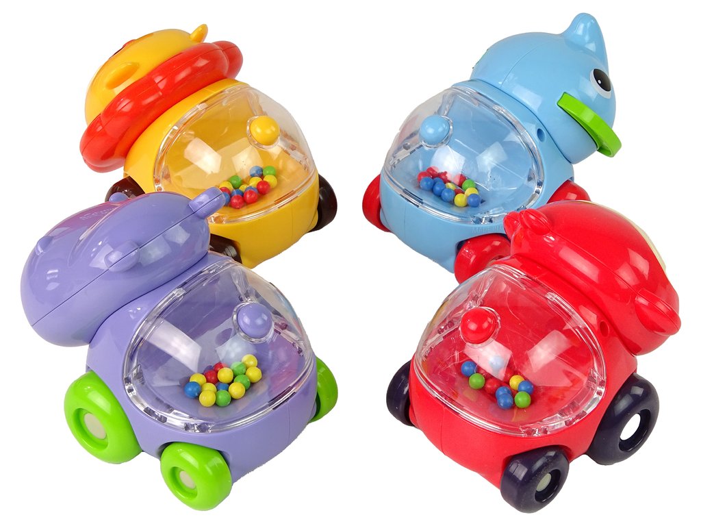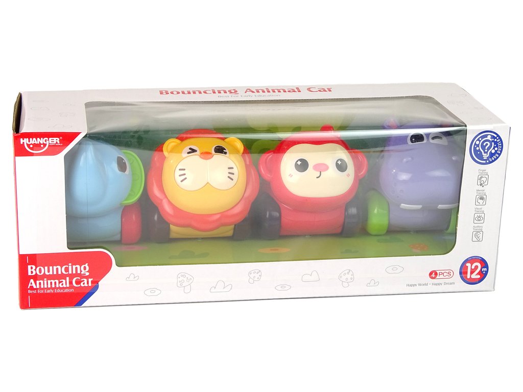 A készlet négy különböző színű autóból áll, vízilóval, oroszlánnal, elefánttal és majommal. Mindegyik tele van apró, színes labdákkal, amelyek lovaglás közben forognak, lenyűgöző vizuális effektusokat hozva létre, amelyek játékra ösztönöznek. A játékautók tartós műanyagból készültek. Minden játékautó egyedi színnel és mintával rendelkezik, ami játék közben ösztönzi a képzelet és a kreativitás fejlődését.