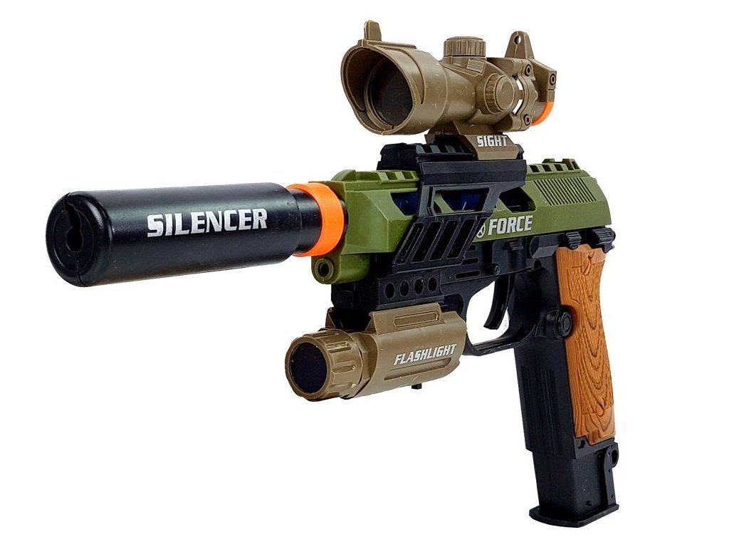 Minden elem kiváló minőségű műanyagból készült, így gyermeke sokáig fog bírni. A készlet sötétzöld árnyalatban van tárolva. Amikor meghúzza a pisztoly ravaszát, lövés, újratöltés és leejtett töltény hangja hallható. A hangtompító felszerelése után a hang megváltozik. Ezen események során megfigyelheti a fegyver fényhatásait is.