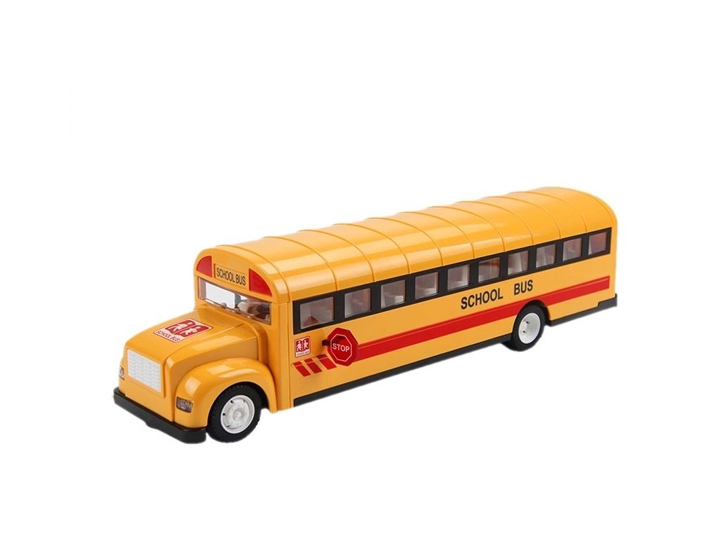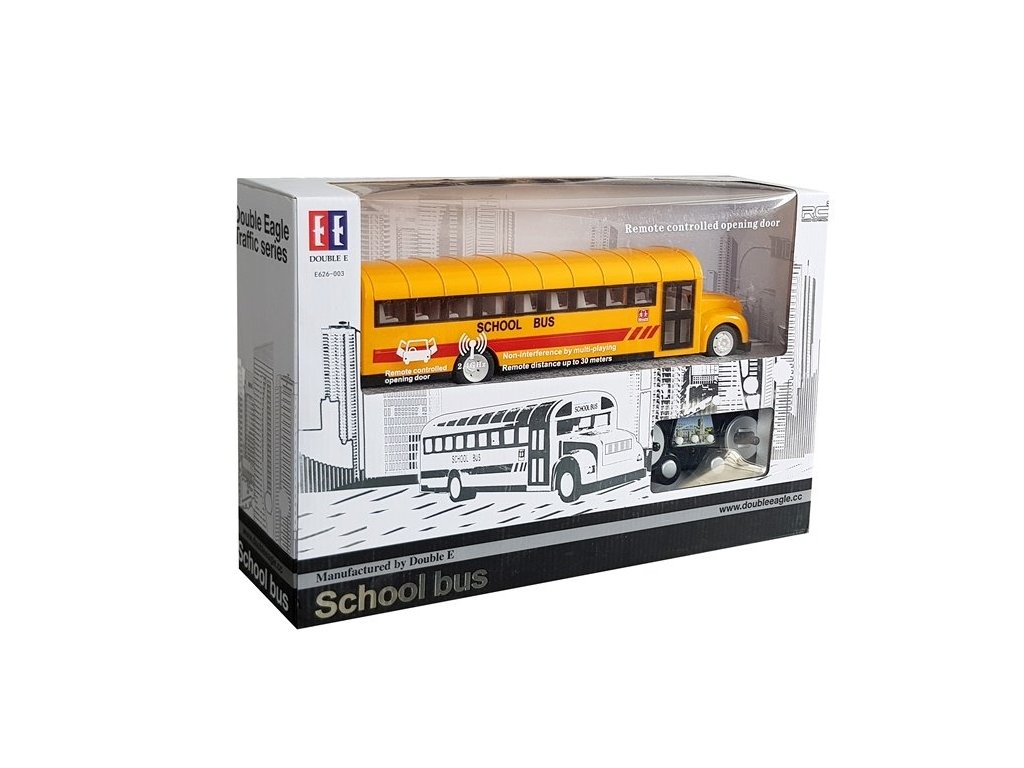 Sárga iskolabusz klasszikus amerikai stílusban. A busz távirányítós és minden irányban közlekedik. A puha kerekek garantálják a szabad és biztonságos utazást különféle felületeken.