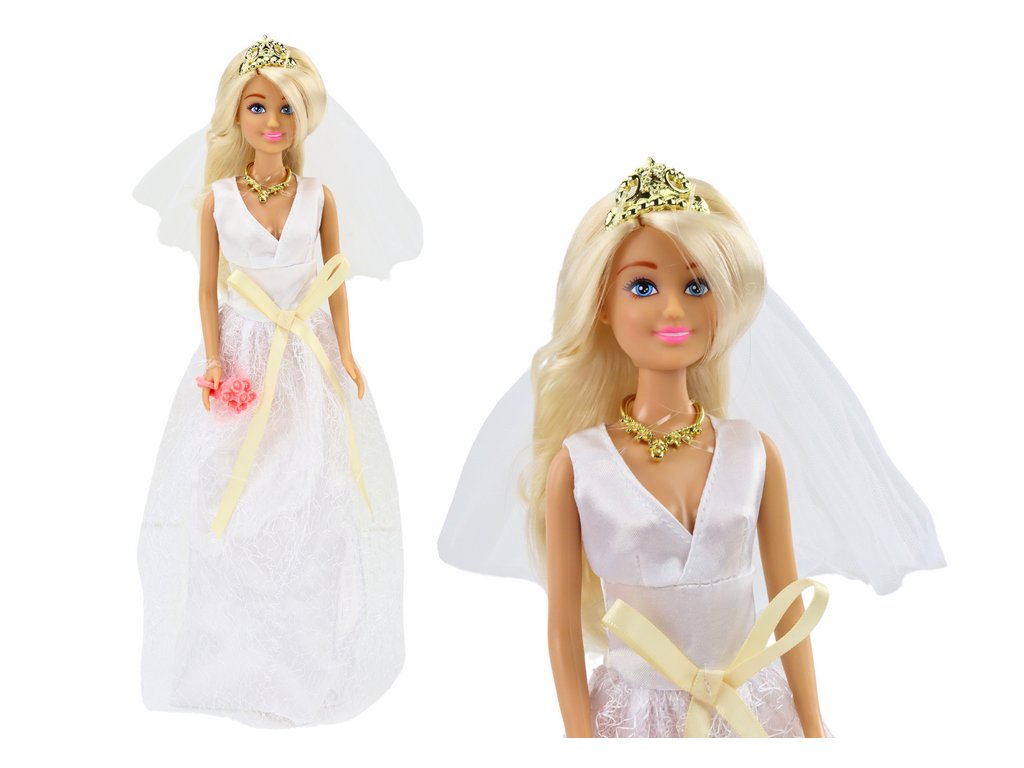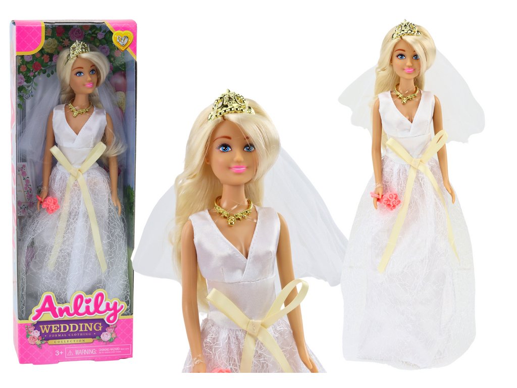 Anlila baba esküvői ruhában csokorral, koronával és nyaklánccal