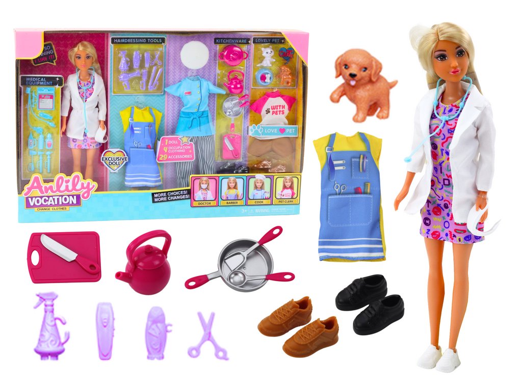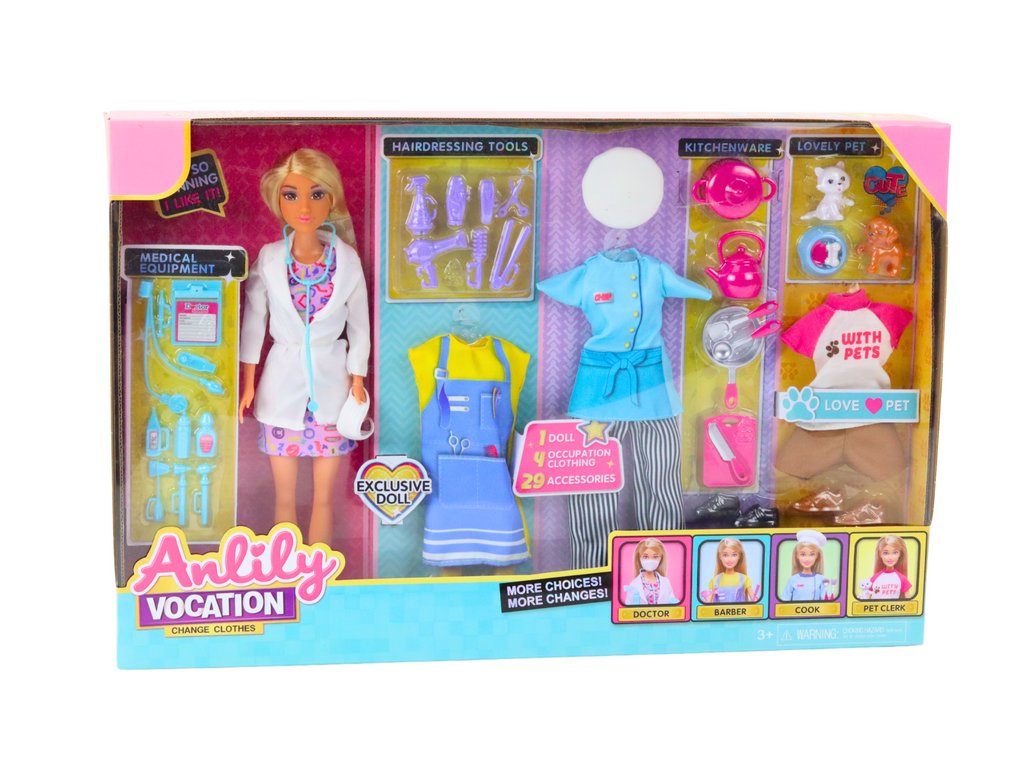 Az Anlily baba nagyszerű lehetőséget kínál a gyerekeknek a kreativitás és a képzelet fejlesztésére szerepjátékokon keresztül. A hosszú, szőke hajú Anlily babához négy egyedi egyenruha és kiegészítő tartozik, amelyektől orvos, fodrász, szakács vagy állatbarát lehet.