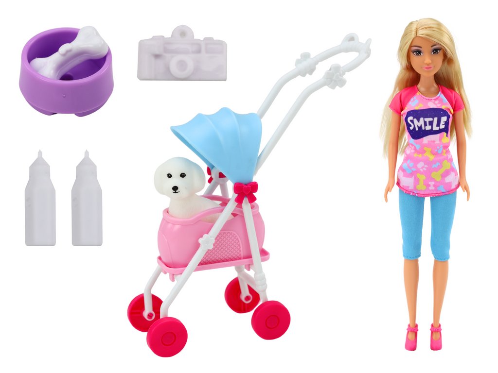 A pasztell színekben pompázó babakocsi nemcsak kényelmes helyet biztosít a kutyának, hanem stílusos kiegészítője is a játéknak. További kiegészítőkkel, például fényképezőgéppel, palackokkal, kockával és tálkával felszerelve különböző jelenetek és történetek létrehozására ösztönöz.