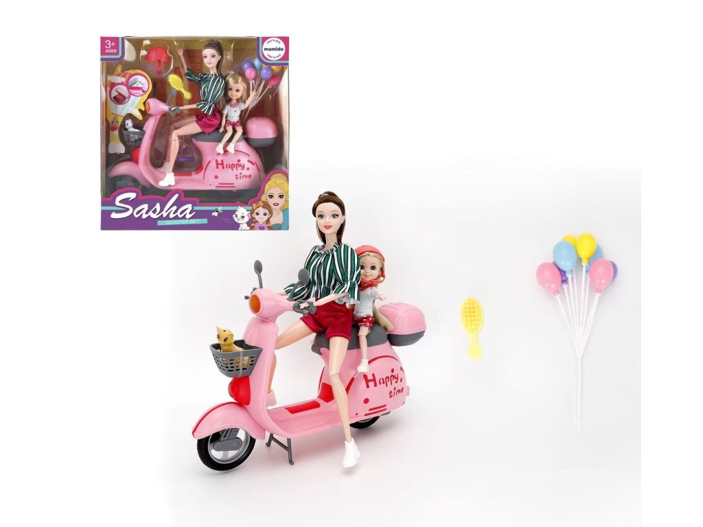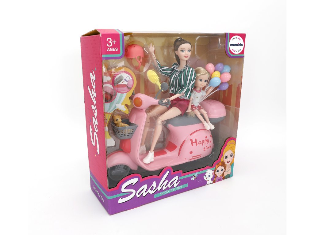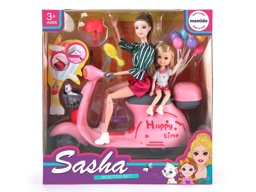 Anya barna hajú baba szőke lányával, robogóval és kiegészítőkkel 30 cm Sasha