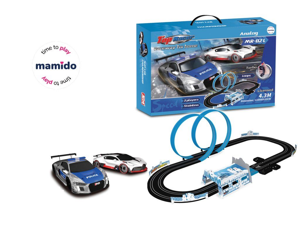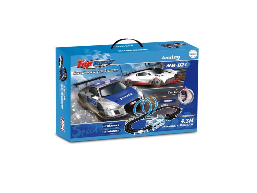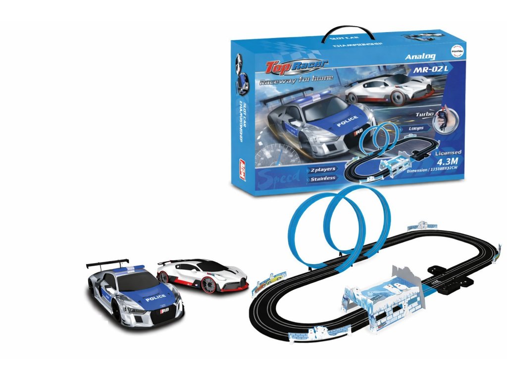 Éld át a Top Racer 4,3 méteres versenypályával a feszültséggel teli versenyeket, amelyek egyenesen a nappalidba hozzák az akciót! A csomagban két részletgazdagon kidolgozott autót találsz – egy sportautót és egy rendőrautót, így belevághatsz egy igazi rendőrségi üldözésbe.