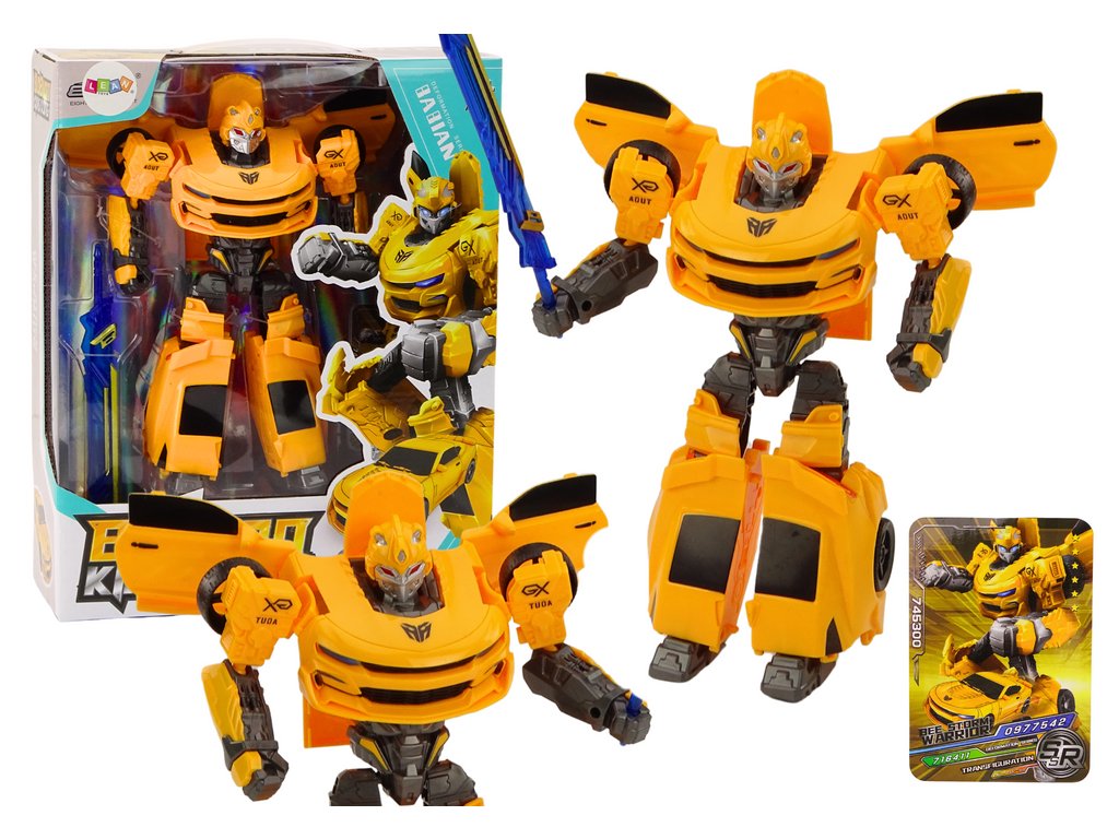Az Auto Robot 2in1 egy rendkívüli modell, amely egyesíti a sportversenyautó eleganciáját és egy nagy robot lenyűgöző alakját. A sárga színben részletgazdag kialakításával tűnik ki, így egyszerre valósághű megjelenésű jármű és robot.