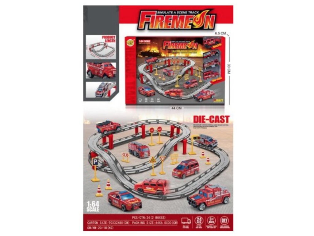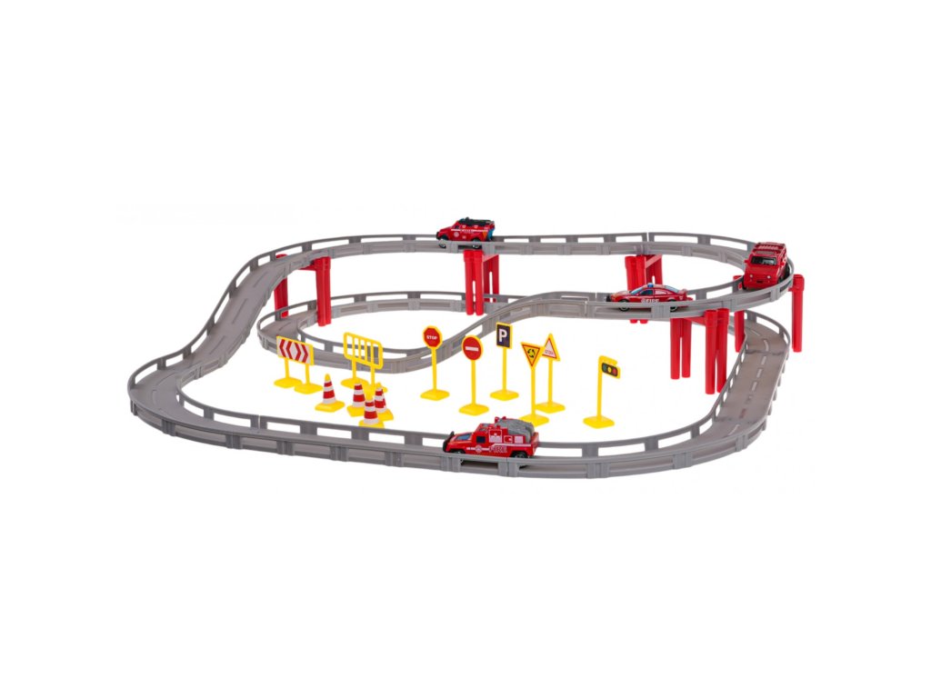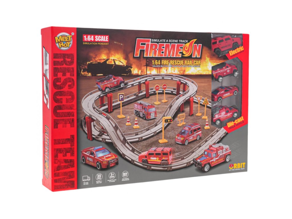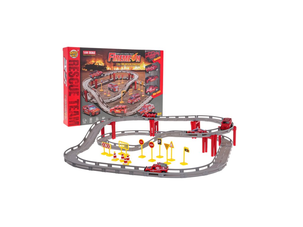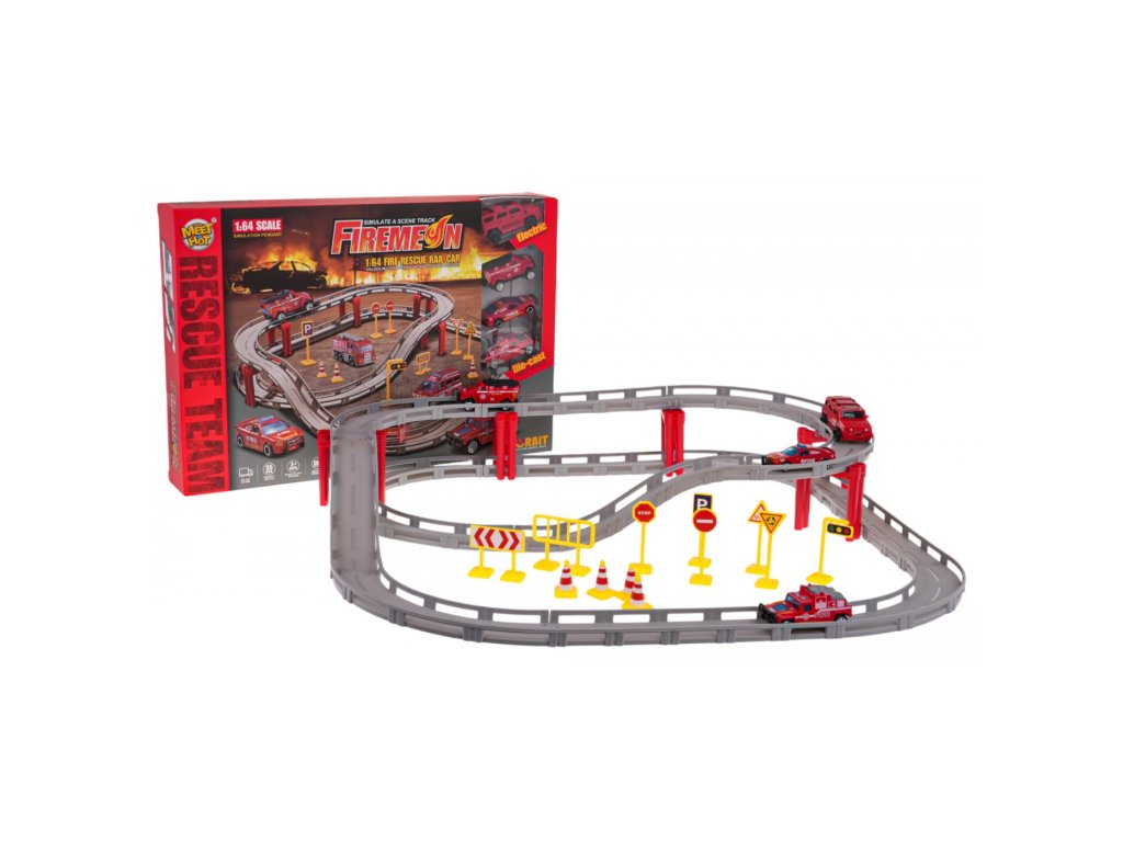 Versenypálya tűzoltó változatban gyerekeknek 3 éves kortól . A pálya a legjobb minőségű műanyagból készült és a csomagban található 4 tűzoltóautó közül 3 fém karosszériával rendelkezik. A pálya 35 darabból áll, amelyek kétszintes szerkezetet alkotnak egyenes szakaszokkal és kanyarokkal. A készlet négy tűzoltóautót tartalmaz.