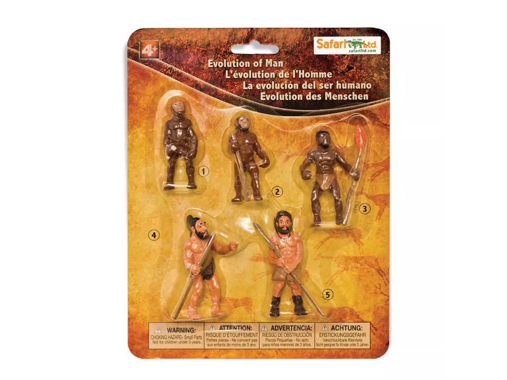 Öt figurából álló készlet, amely az emberi evolúció fő szakaszait ábrázolja. A figurák lehetővé teszik a gyermekek számára, hogy szemléletesen tanulmányozzák az egyes szakaszok anatómiájában és viselkedésében bekövetkező változásokat, és támogatják a tanulást manipuláció és megfigyelés révén.