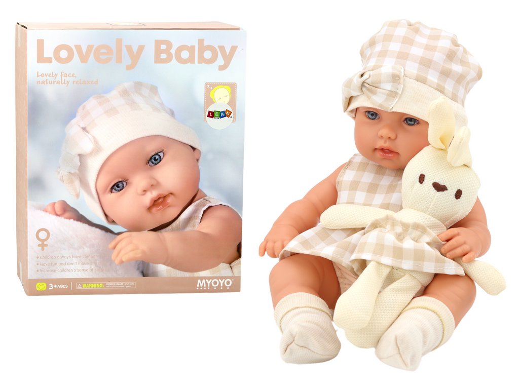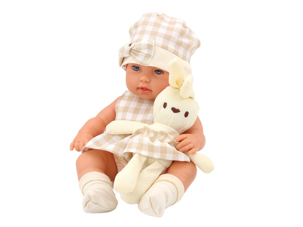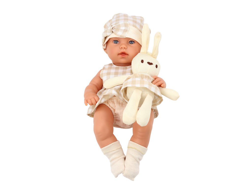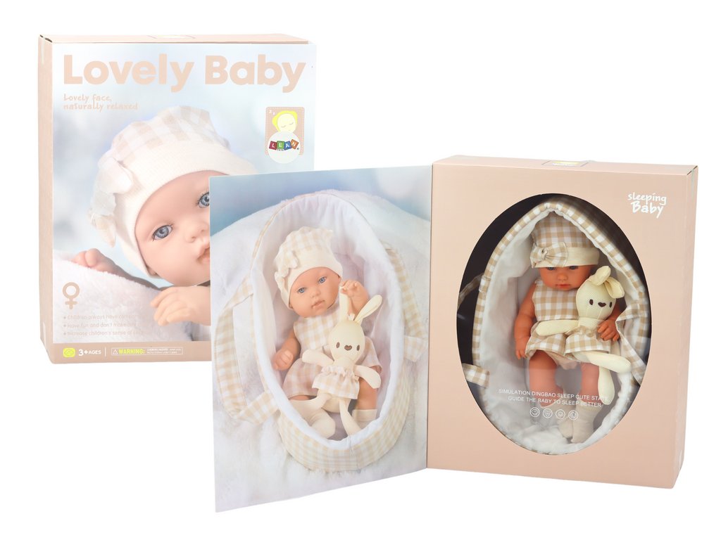 A hordozóban lévő baba baba egy kivételes játék, amely elrepíti a gyerekeket a gondozás és a kis barátról való gondoskodás világába. Egy aranyos, bézs és fehér kockás ruhába öltözve, egy masnival és zoknival ellátott sapkával, valamint egy plüss nyúllal rendkívül aranyosnak és hívogatónak tűnik a baba.