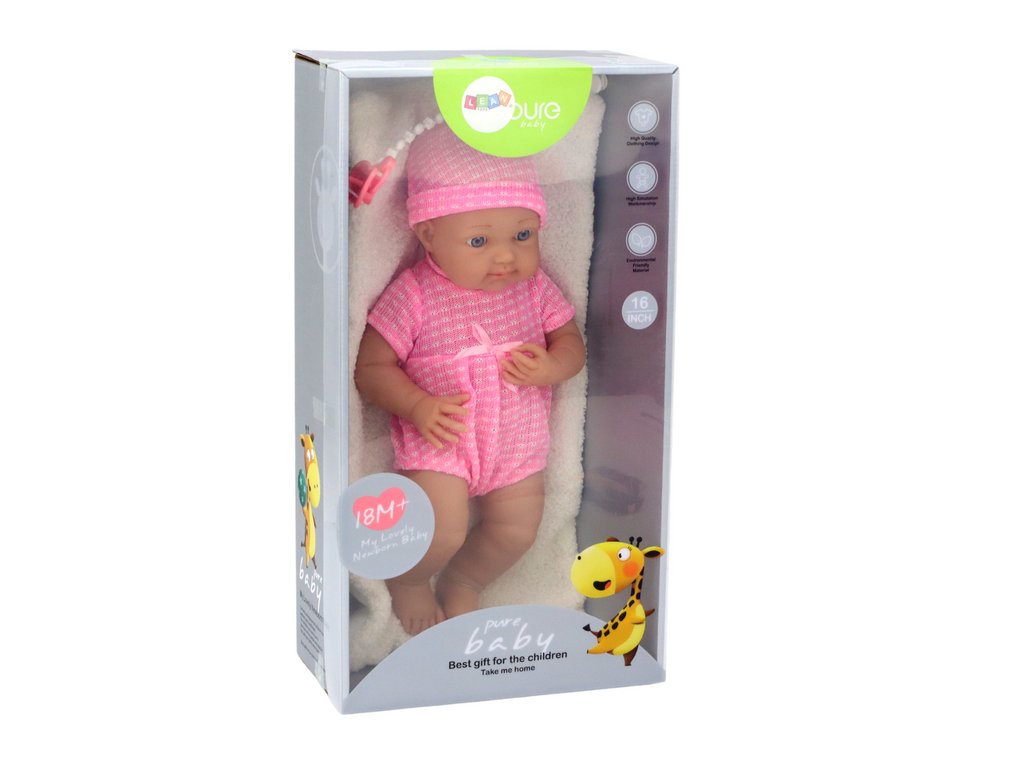 Baba baba rózsaszín ruhában sapkával, cumival és takaróval