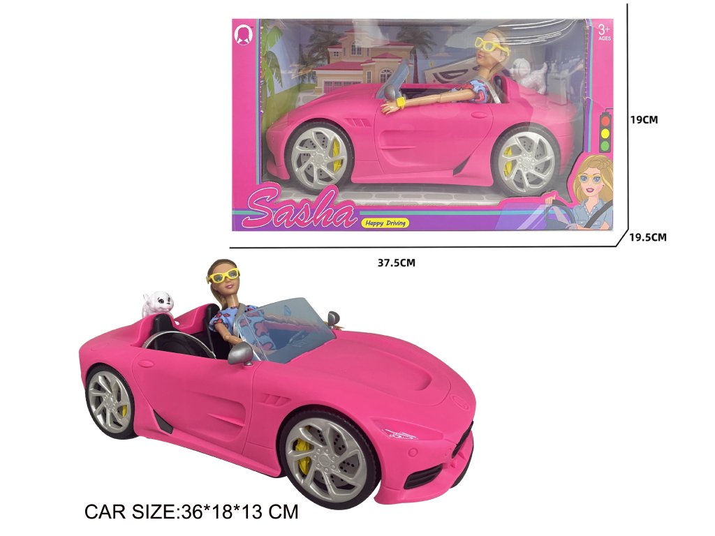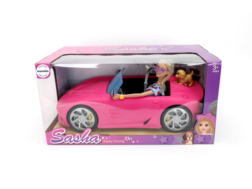 A rózsaszín sport roadster valósághű részleteket kínál – kormány, ülések, szélvédő és nagy kerekek. Sasha baba stílusos ruhákkal és szemüveggel van felszerelve, hogy illeszkedjen az autójához. A könnyű konstrukciónak köszönhetően az autóval könnyű bánni, és végtelen történetek terét nyitja meg a gyerekek számára.