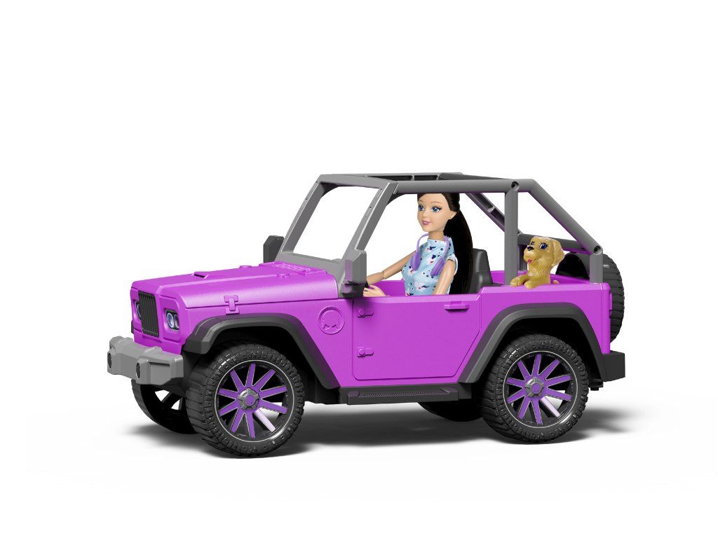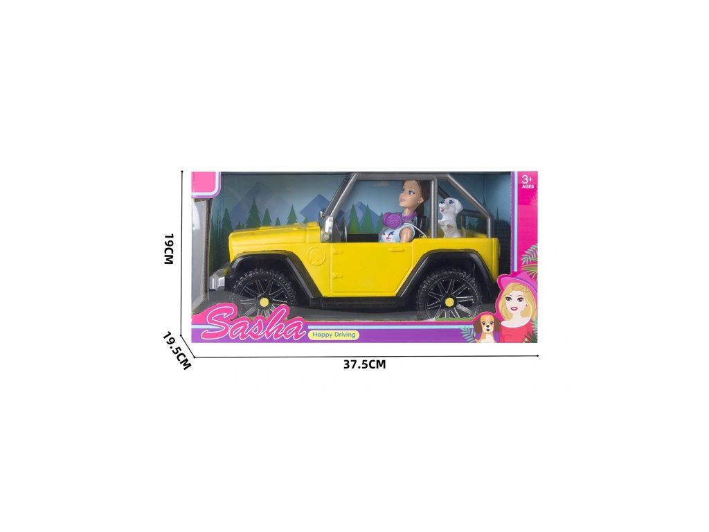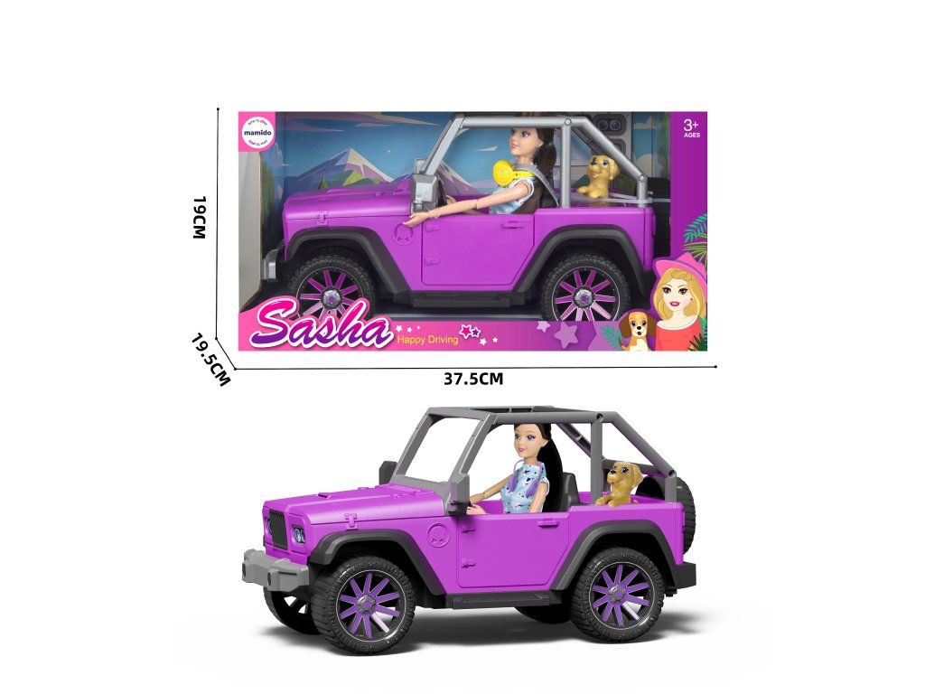A terepjáró nyitott felépítéssel, nagy kerekekkel és valósághű részletekkel rendelkezik, amelyek még szórakoztatóbbá teszik a játékot. A baba modern, divatos ruhát és fejhallgatót visel, így készen áll a városi és természeti utakra. A nagy kutya barát bent ülhet az autóban, és elkísérheti a babát minden útján.