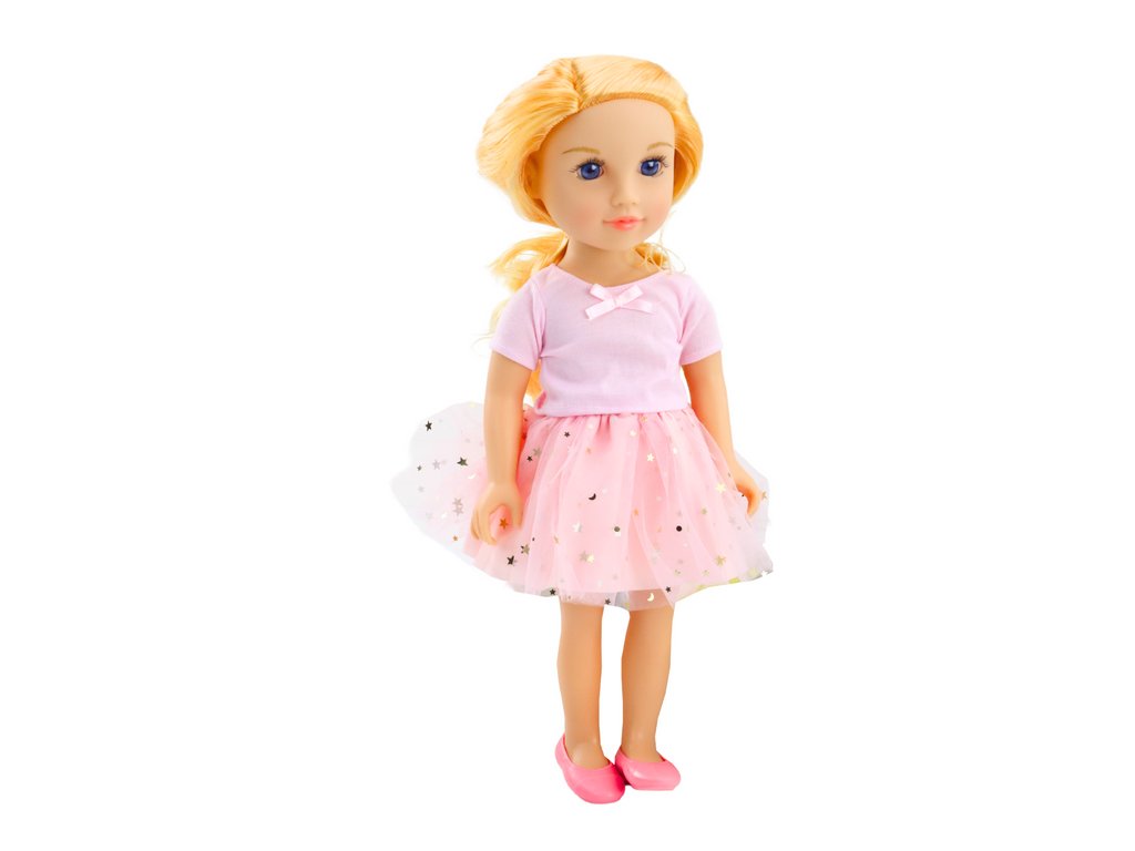 A baba egy aranyos, lányos ruhába van öltözve, amely varázsával és eleganciájával varázsol el. A tüllén arany csillagokkal díszített rózsaszín ruha mesebeli megjelenést kölcsönöz neki, bármilyen alkalomra tökéletes. A ruhák finom anyagokból készülnek, amelyek nem csak esztétikusak, de kellemes tapintásúak is.