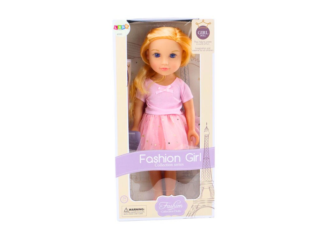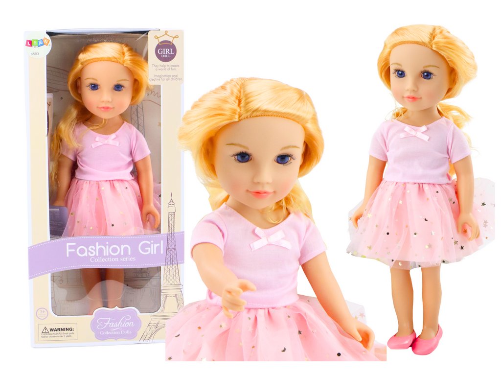 Baba rózsaszín ruhában, tüll és szőke hajjal