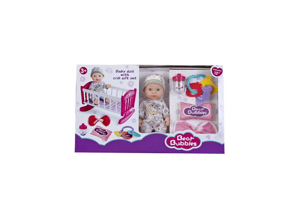 A baba finom, hold mintás pizsamában és sapkában van. A készlet tartalmaz egy bölcsőt, amely finoman ringatható, valamint gondoskodási kiegészítőket – cumit, cumisüveget, csörgőket és egy kis párnát takaróval. A gyerekek saját történeteket alkothatnak, lefektethetik a babát aludni, vagy megetethetik és megvigasztalhatják.