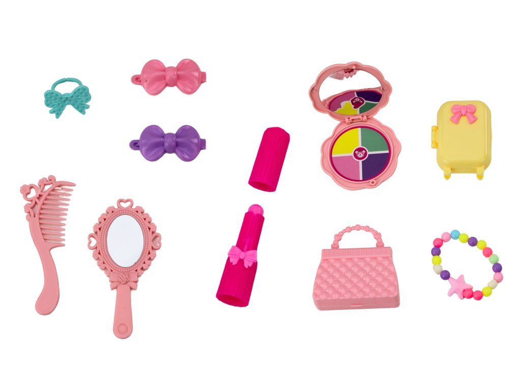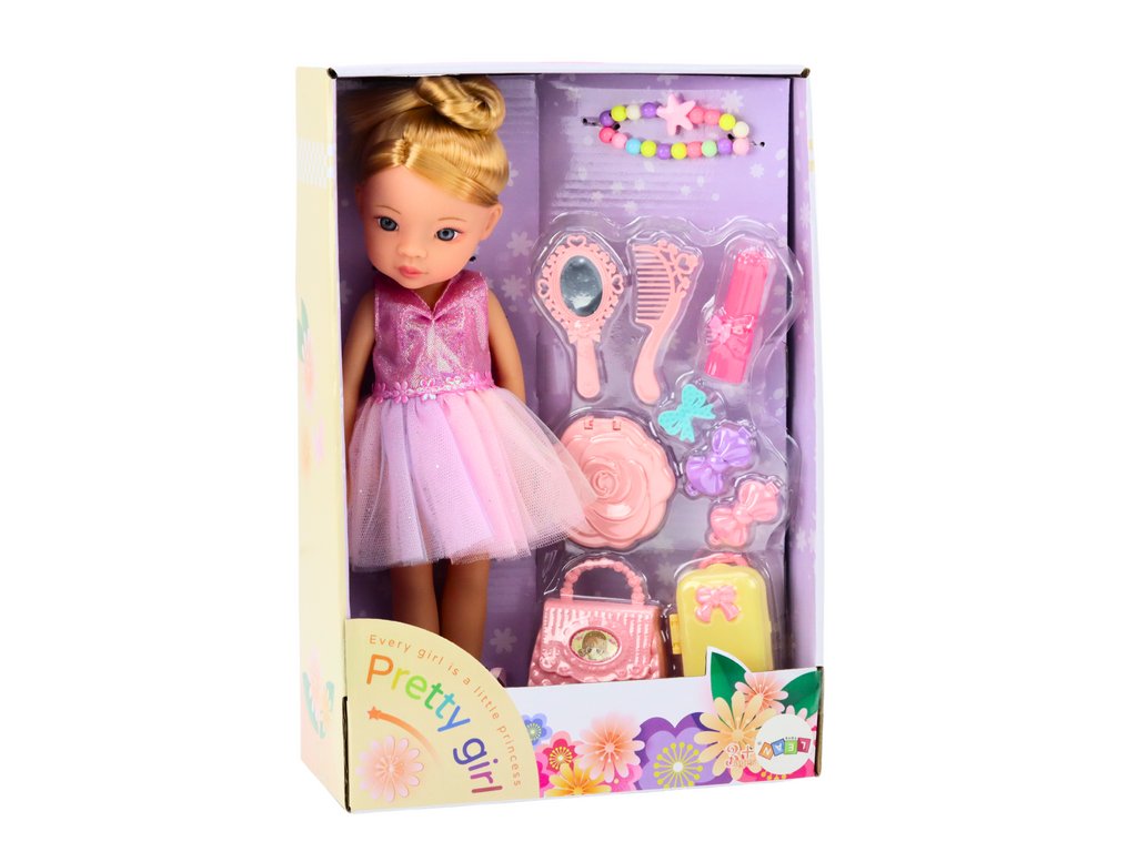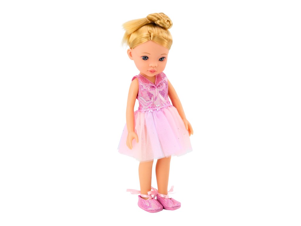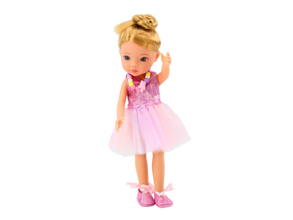 A baba elegáns rózsaszín balettszoknyába van öltözve, amely ragyog és magára vonzza a figyelmet. Klasszikus balettcipőket visel a lábára kötve, így az igazi balerina autentikus megjelenését kölcsönzi neki. A bábnak hosszú, szőke haja magas kontyba rendezve, ami kiemeli balettstílusát. Finom sminkje és színes nyaklánca kecsességet és eleganciát kölcsönöz a megjelenésének. A stílusos kézitáska ideális kis bábos kiegészítők számára. Funkcionális bőrönd, amelyet a báb magával vihet balettútjaira. Clipek, amelyekkel a báb haját formázhatjuk. Egy kis gyűrű, amely eleganciát ad a bábnak. Egy tükör, egy ecset és egy praktikus tükör, amely lehetővé teszi a bábos számára, hogy a balettelőadások előtt ellenőrizze megjelenését.