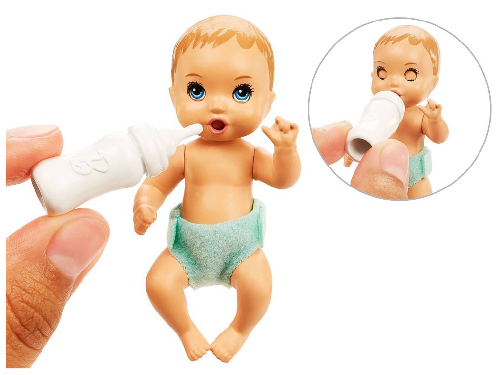 Az egész készlet a baba etetésére és alvására összpontosít. Ezért a készletben talál egy cumisüveget, amit meg kell etetni a babával, és egy cumit. Amikor cumisüveget vagy cumit adsz a babának, észreveheted, hogy fáradtan lehunyja a szemét, és amikor elveszed, izgatott arckifejezéssel tér vissza. Evéskor eljön az alvás ideje - erre alkalmas egy kényelmes ágy bölcsővel, egy csillagokkal tarkított takaró és természetesen egy mackó. Annak érdekében, hogy a baba gyorsabban elaludjon, Barbie használhat egy mesés könyvet – csak a gyermek fantáziája határozza meg, hogy ma melyik mesét hallja a baba.