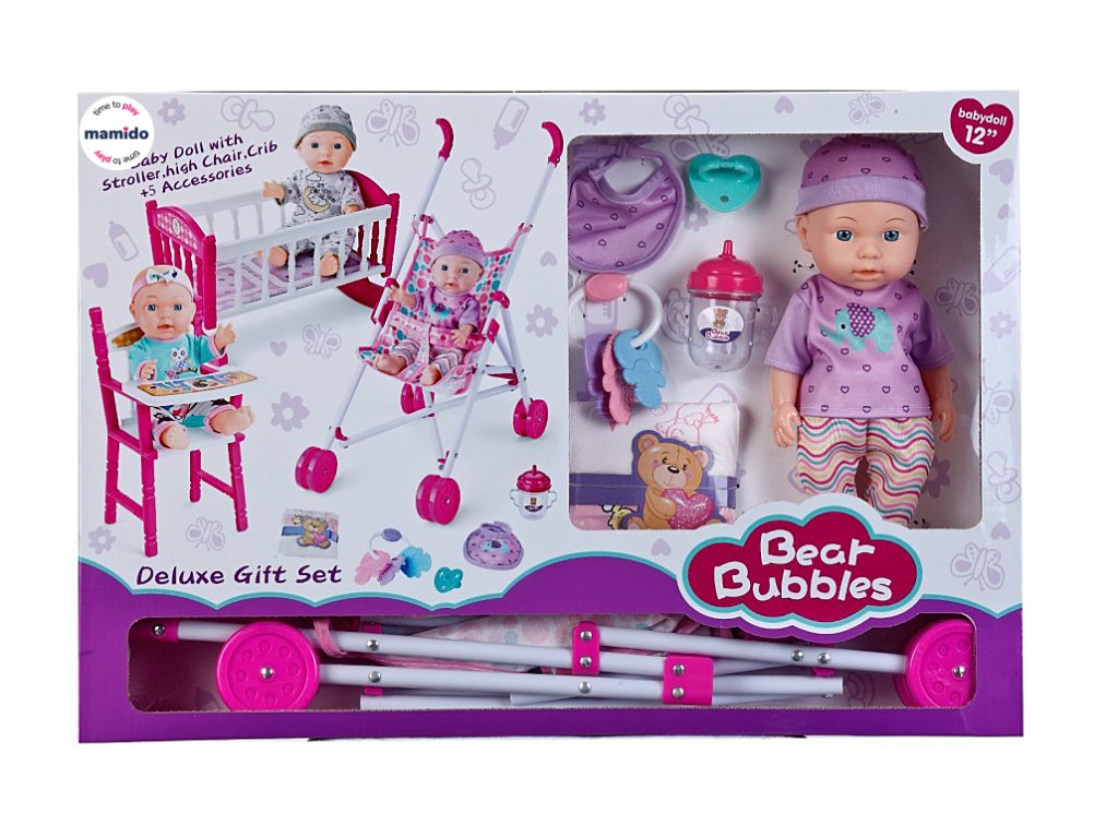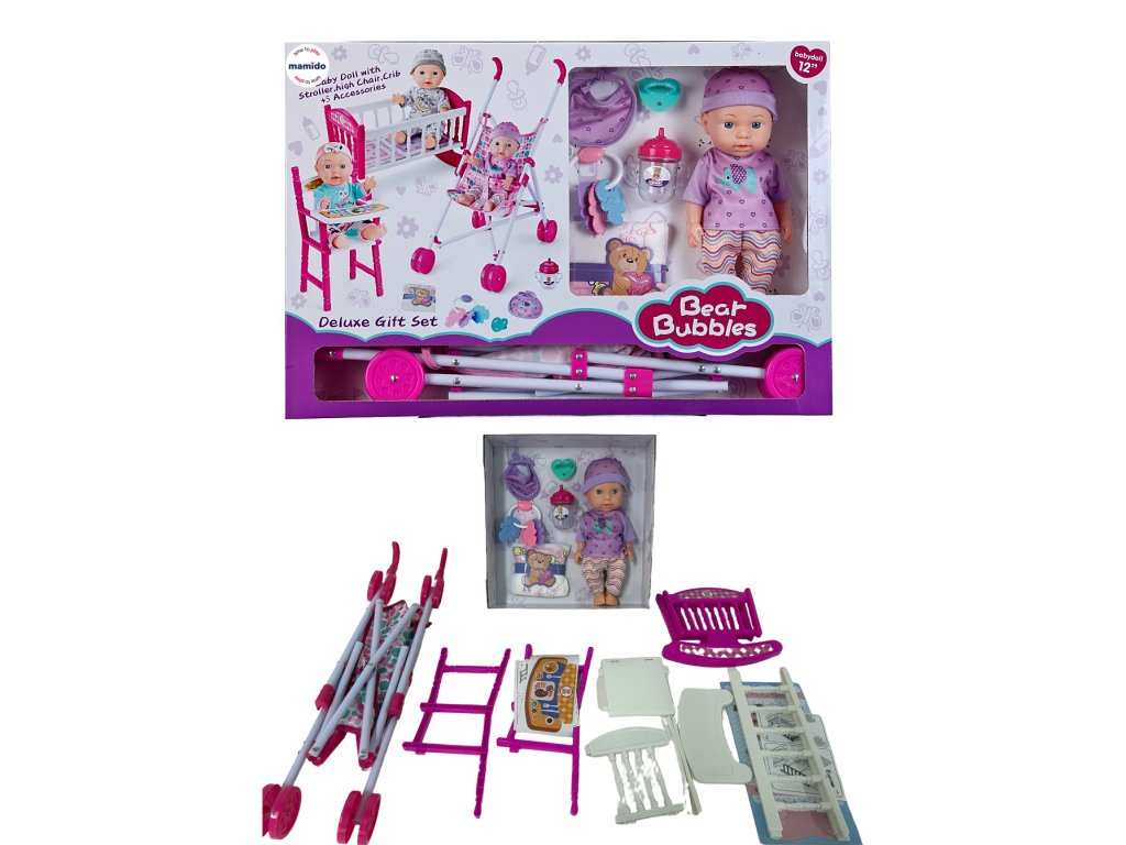 Teljes gondoskodó szett, amellyel a gyerekek mindenben gondoskodhatnak babájukról! A 12 hüvelykes (kb. 30 cm) baba mellé praktikus babakocsi, etetőszék, bölcső/kiságy és bőséges kiegészítő tartozik. Ideális ajándék azoknak a gyerekeknek, akik szeretnek szülőset játszani és babázni.