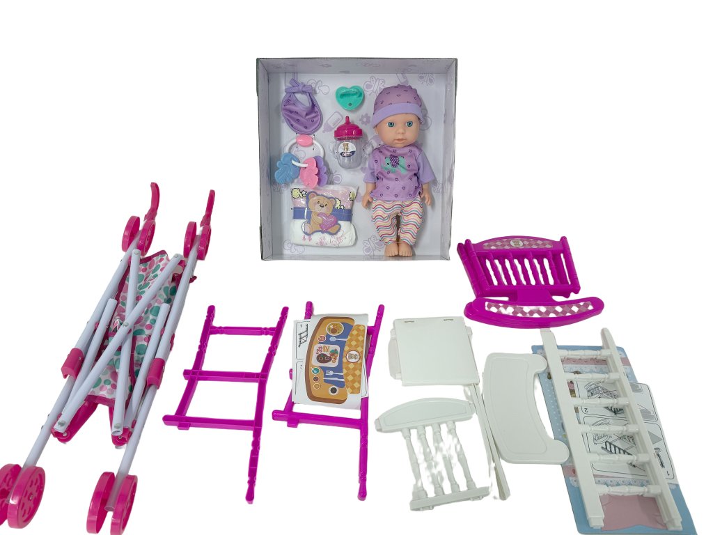 A baba finom vonásokkal rendelkezik, mozgatható karokkal és lábakkal, és egy aranyos sapkás szettre van öltöztetve. A szett tartalmaz egy összecsukható babakocsit, amely könnyű és könnyen kezelhető, valamint egy etetőszéket a etetéshez és egy összeállítható bölcsőt/kiságyat.
