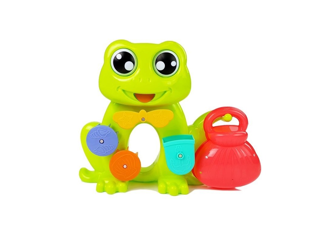 Miután vizet öntött a béka fejébe, az áram meghajtja a forgó elemeket, majd a víz kifolyik a szájból és a béka szeme megfordul. Hátul tapadókorongok találhatók a fürdőszobában való rögzítéshez. A békához 4 db különböző színű és méretű színes pohár tartozik. Most a gyerekek már nem félnek a víztől.