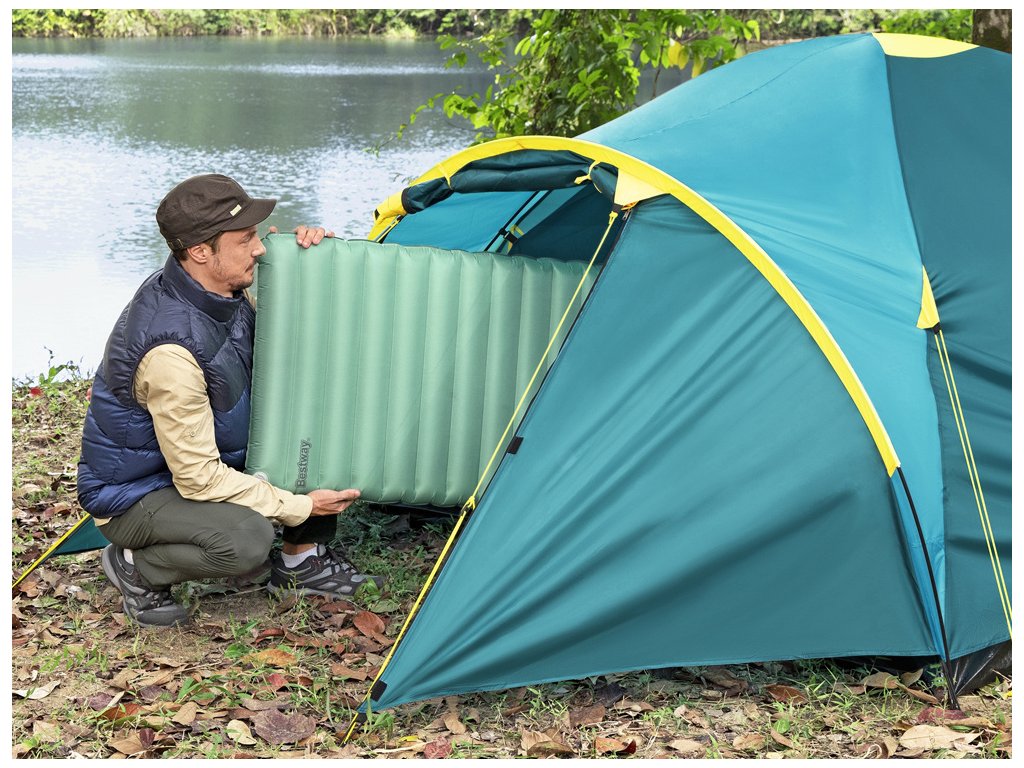 A Bestway AdventuRest túraszőnyeg ideális megoldás mindazok számára, akik értékelik a kényelmes pihenést napozás, sátorozás vagy egyszerűen csak a szabad levegőn, sátorban való alvás közben. A téglalap alakú betét tökéletesen illeszkedik a közepes méretű hálózsákokba. Ennek a szőnyegnek az előnye a könnyű és gyors felfújás az innovatív AirCinch ™ rendszernek köszönhetően. A felfújás zacskó segítségével történik, csak kézzel kell megnyomni (gyártói információ), hogy a szőnyeg megteljen levegővel. Nem kell attól tartania, hogy elfelejti becsomagolni a pumpát, mert ez a készlet kész. Ha a szőnyeg elérte a kívánt felfújási szintet, zárja el a szelepet, és élvezze a pihenést.