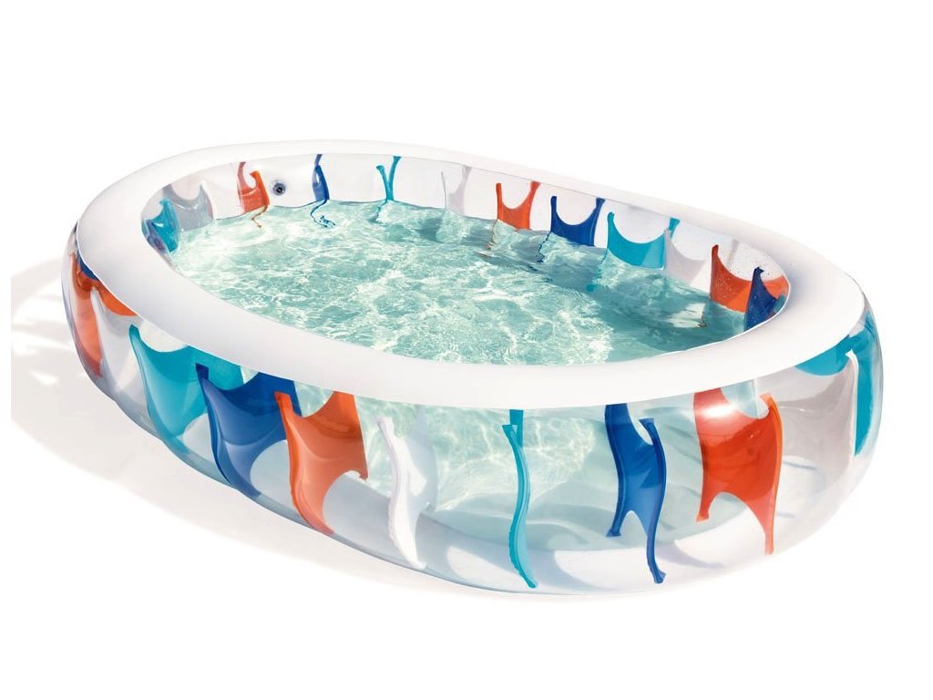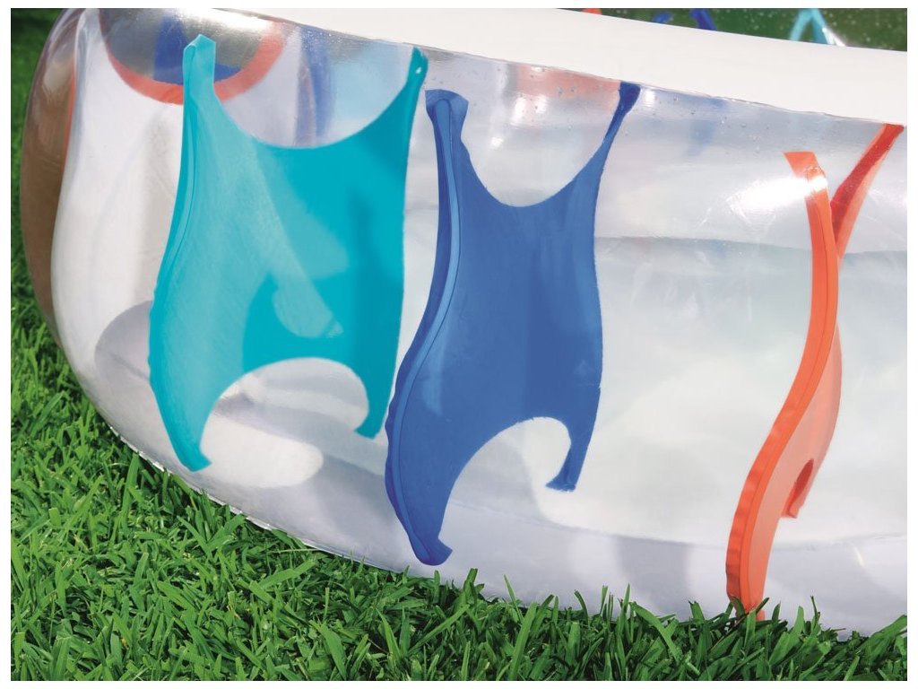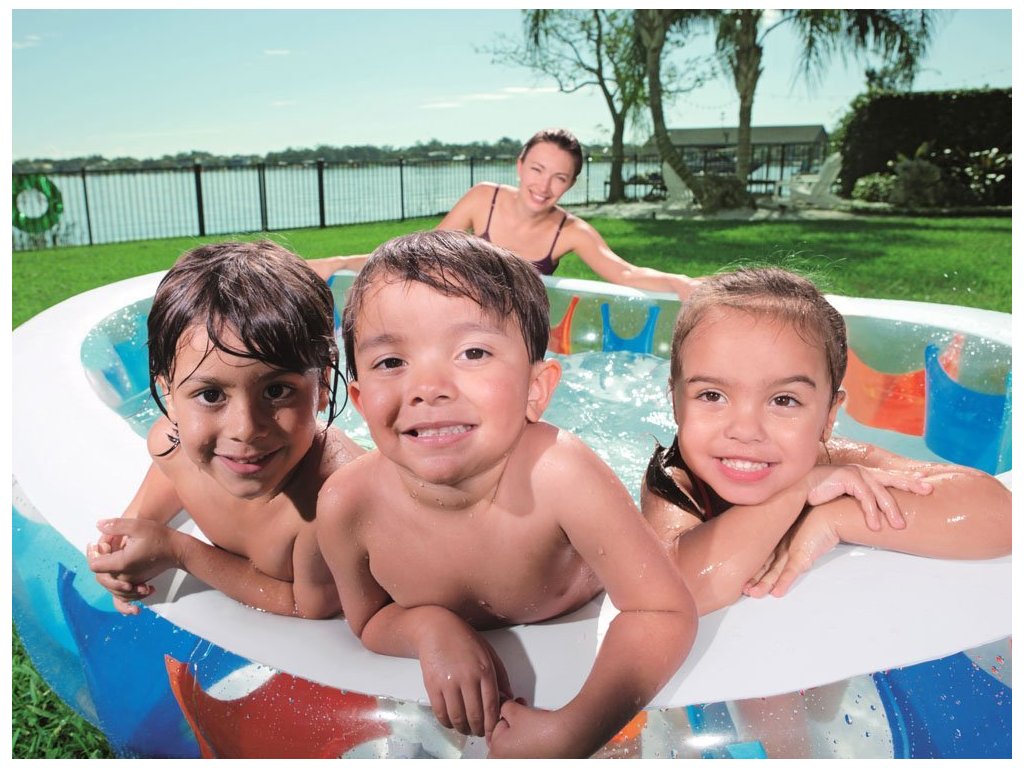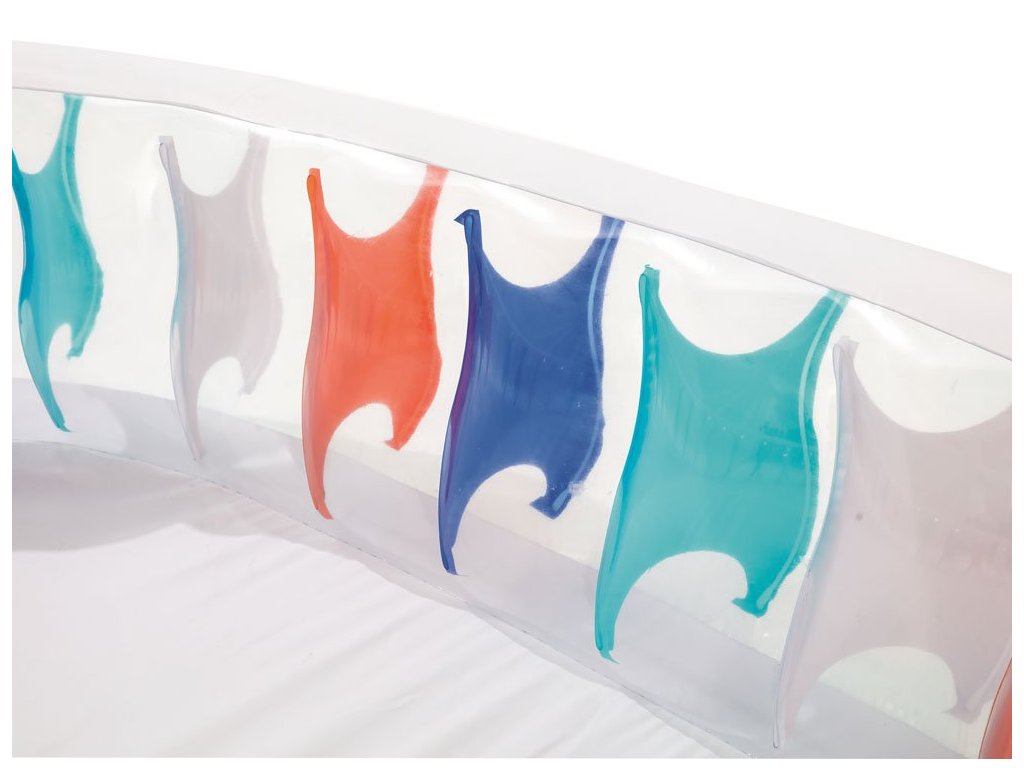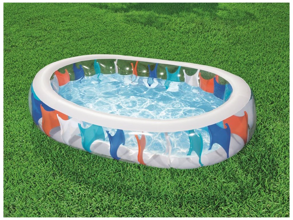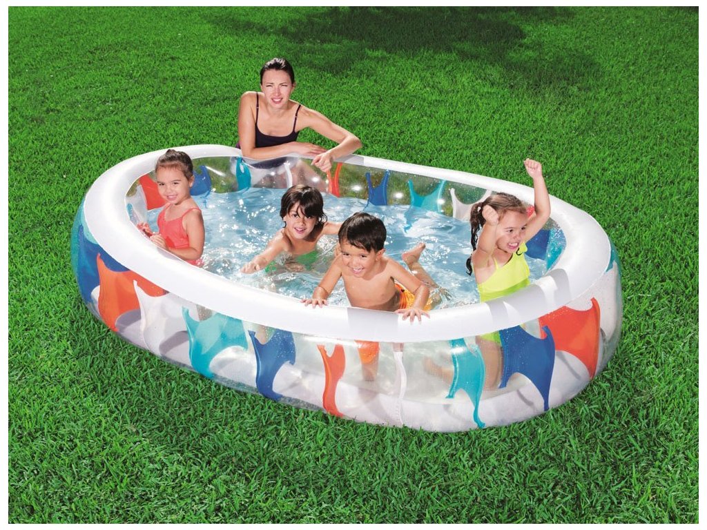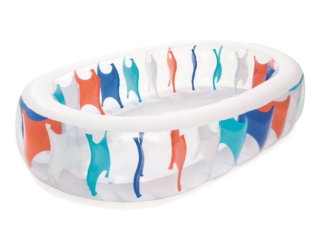 A Bestway színes, felfújható, ellipszis alakú medencéje minden kis úszónak sok örömet okoz egy forró napon.