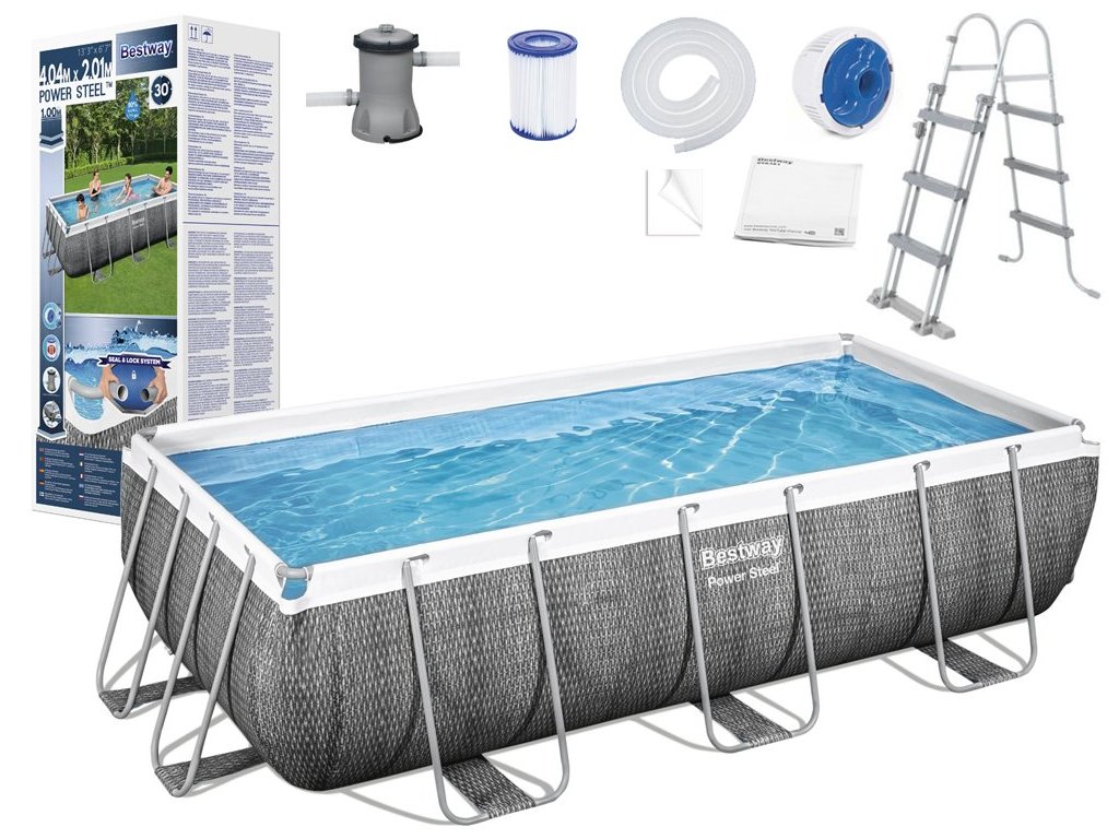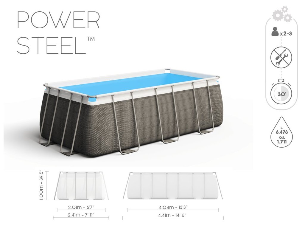 A Bestway POWER STEEL egy 404 x 201 x 100 cm méretű, 6478 literes űrtartalmú kerti medence . A kerti medence elég nagy ahhoz, hogy a gyerekek és a szülők egyszerre használják. A medence esőnek és változó időjárási viszonyoknak ellenálló fémszerkezetből készült. A rendszerben használt speciális rögzítőelemek megakadályozzák a korróziót. A medence Tritech anyagból készült, mely poliészter hálóból és két réteg PVC-ből áll.