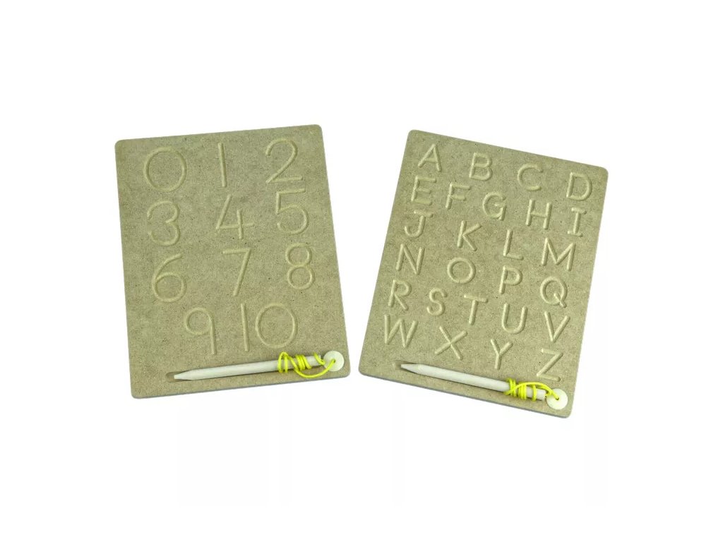 Három darabos készlet betűk és számok gravírozott formáival ellátott táblákból, amely az írás gyakorlására és a helyes ceruzafogás elsajátítására szolgál.