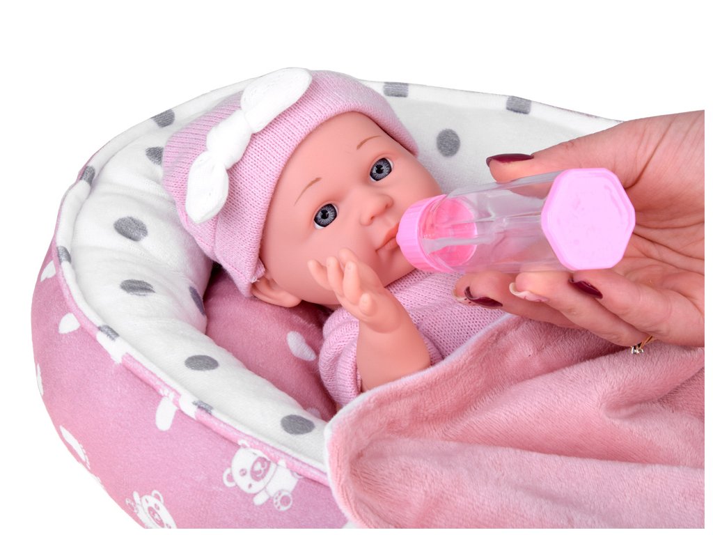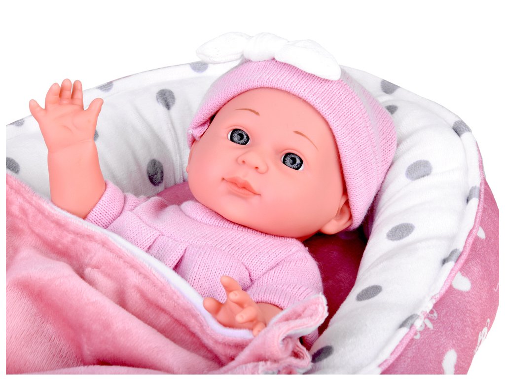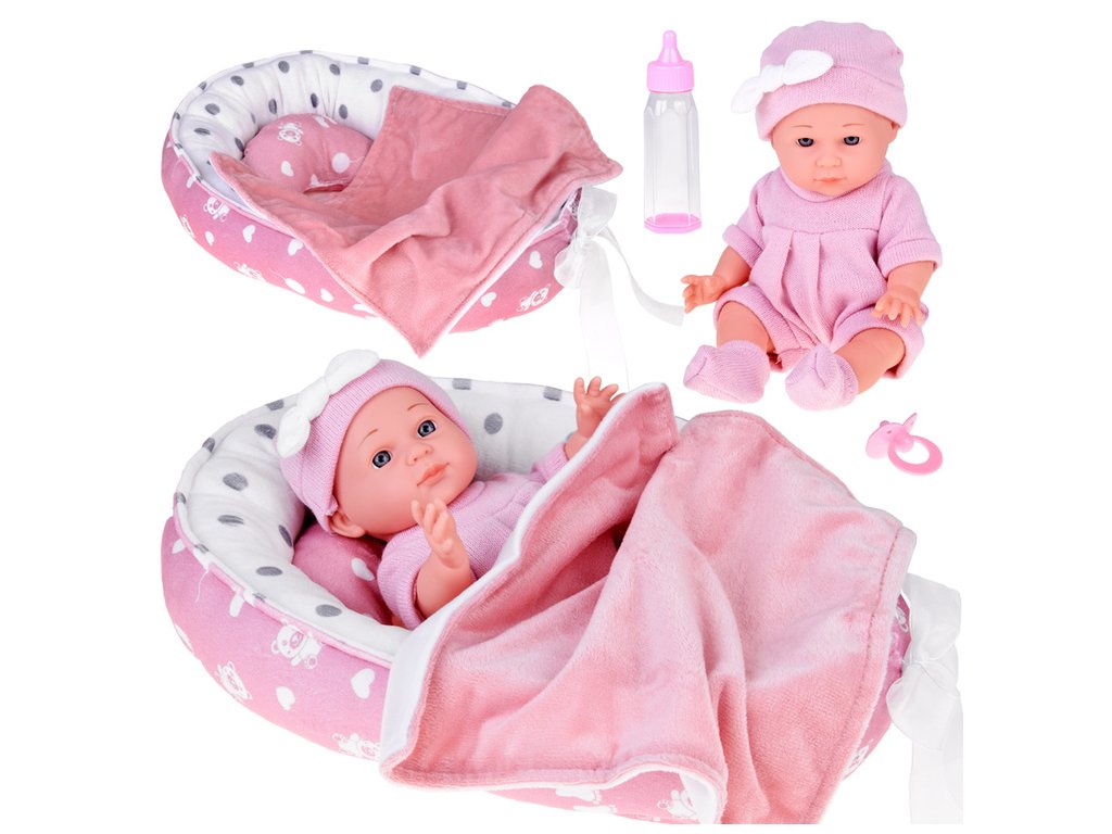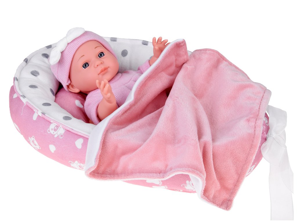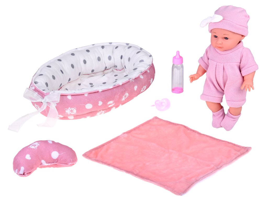 A Bobas baba egy aranyos fészekben, rózsaszín szettbe öltözve – ideális társ a gyermekjátékokhoz.
