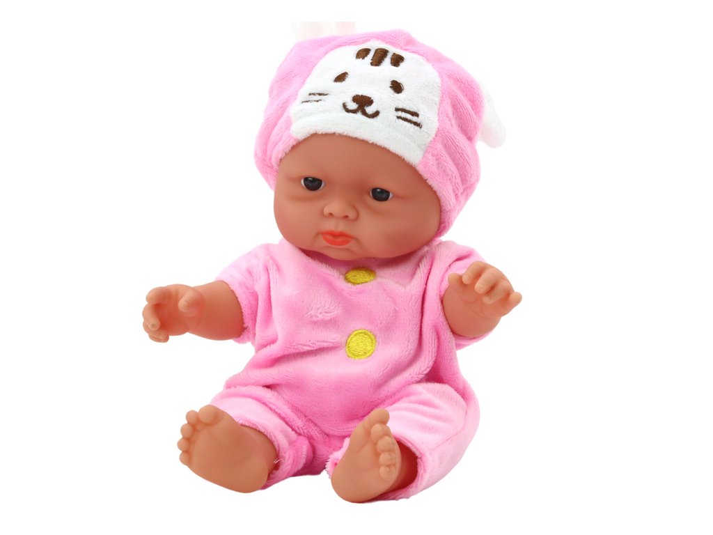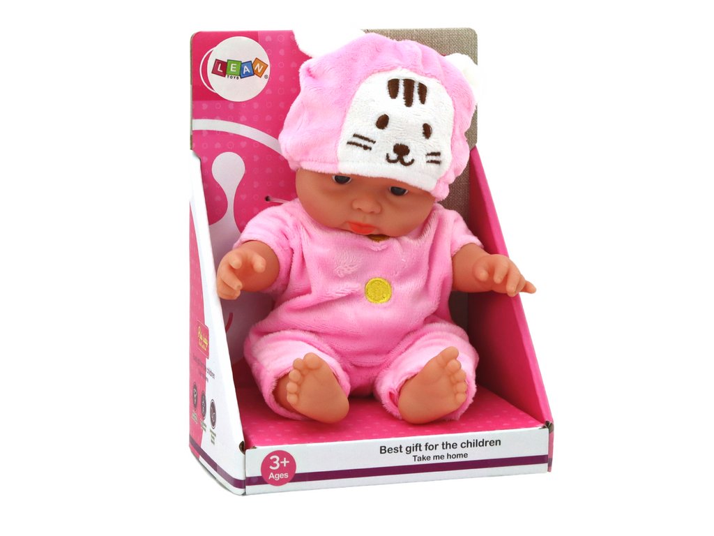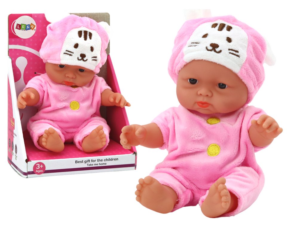 Ez a kis baba 21 x 14 cm-es, és tökéletes társ minden kislány számára. Imádnivaló rózsaszín ruhába öltözött, sárga gombokkal díszítve, ami bájos és édes megjelenést kölcsönöz neki. A babánknak van egy nyuszira emlékeztető füles sapkája is, ami tovább növeli a varázsát.