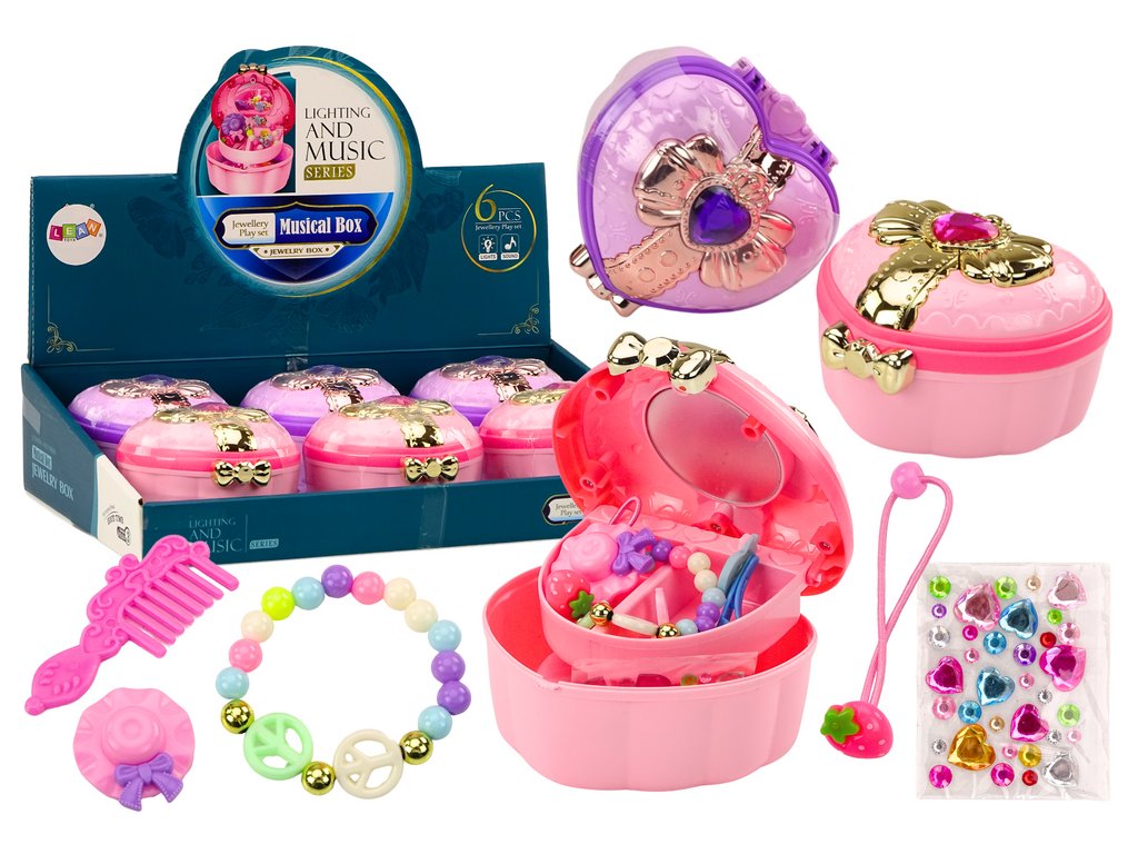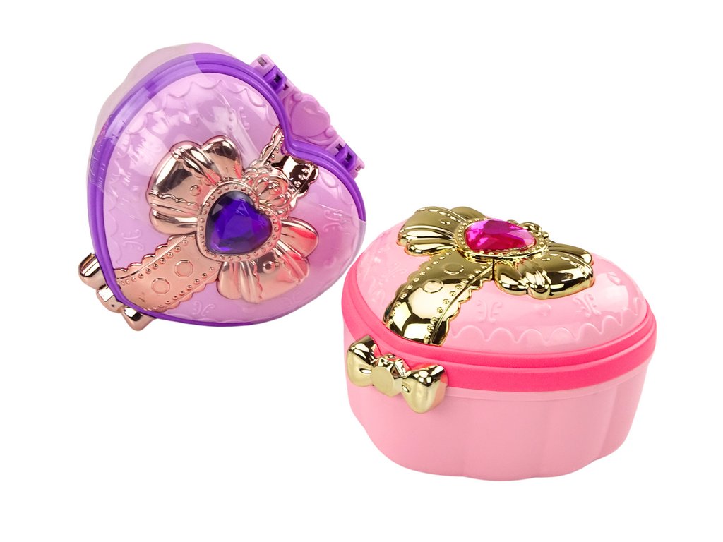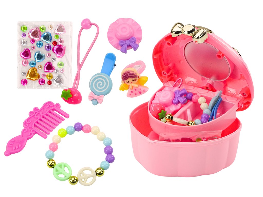 Stílusos szív alakú szekrény, arany részletekkel díszítve. A tetején egy nagy, színes szív található, rózsaszín vagy lila színben, amely vonzza a tekintetet és bájt kölcsönöz. A készlet sok különböző kiegészítőt tartalmaz. Elegáns és színes karkötő, amely bármilyen ruhához ideális. Praktikus és dekoratív hajtűk különböző frizurák létrehozásához. Egy aranyos gyűrű, amely ragyogást kölcsönöz egy kis kéznek. Praktikus fésű, ideális mindennapi használatra és hajformázáshoz. Funkcionális és esztétikus hajgumi, amely a helyén tartja a hajat. Csillogó, színes kőkészlet, mely dekorációnak vagy ékszer részeként is használható.