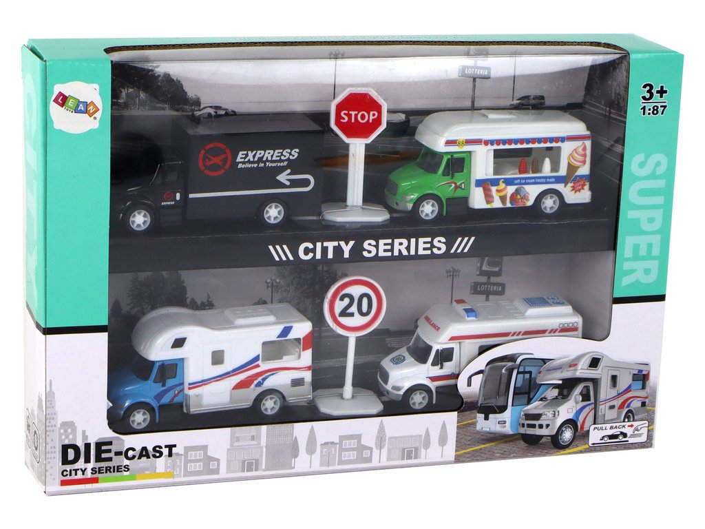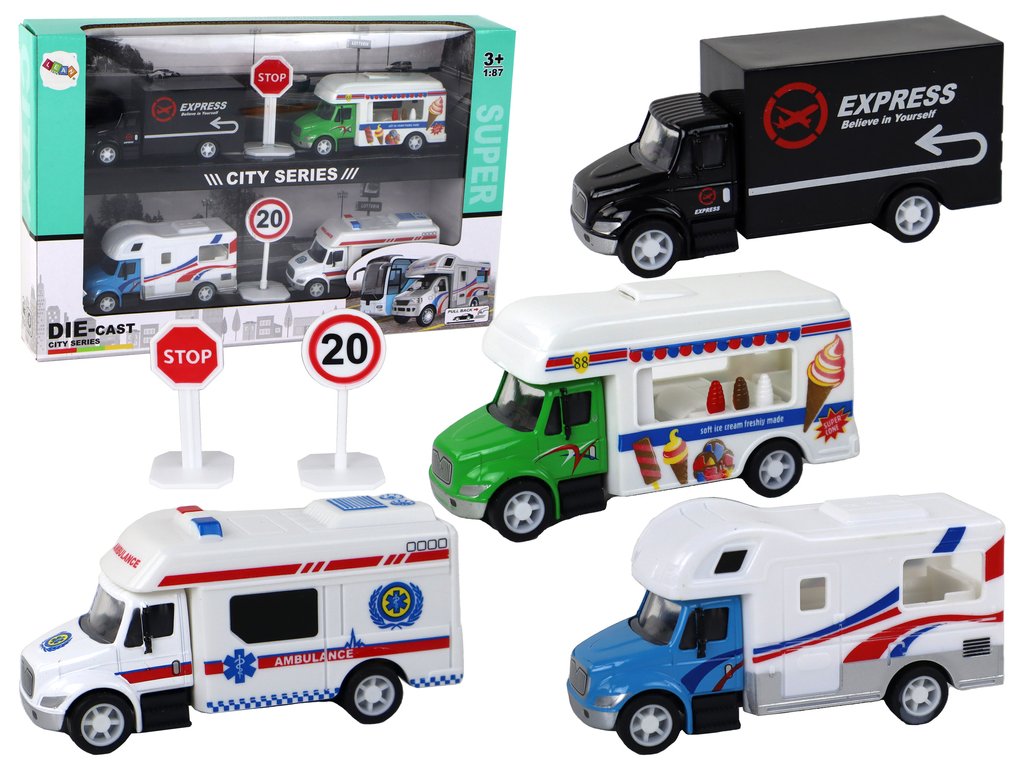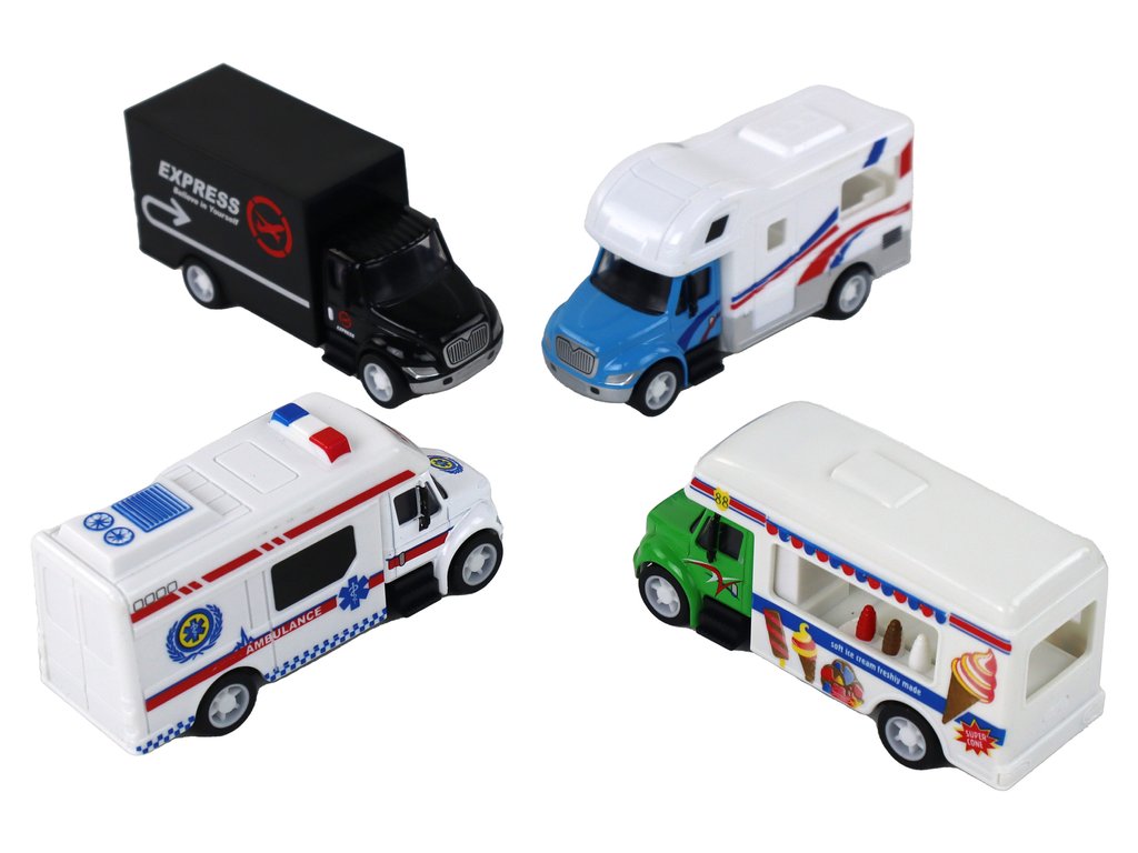 Ez a készlet tartalmaz egy fekete teherautót, egy kerekes fagylaltos teherautót, egy útra kész lakóautót és egy mentőautót, amely készen áll a drámai, látszatmentésekre. Minden jármű pontosan reprodukálódik 1:87 méretarányban, így valósághű megjelenést és egyedi vonzerőt biztosít.