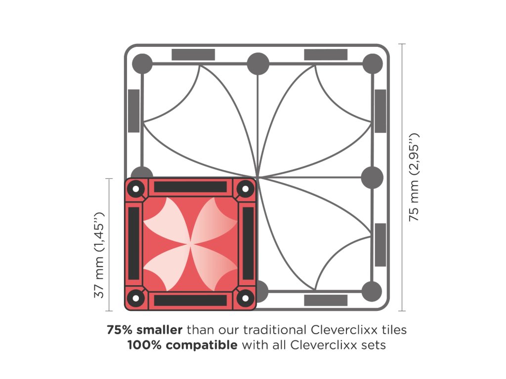 Tato mini sada podporuje rozvoj STEAM dovedností (věda, technologie, inženýrství, umění a matematika) prostřednictvím volné hry. Děti se učí rozpoznávat tvary, stavět stabilní konstrukce a přemýšlet logicky – a to vše hravou formou. Všechny sady Cleverclixx jsou navíc vzájemně kompatibilní, takže Mini Tiles Pack jednoduše doplní jakoukoli stávající sbírku.