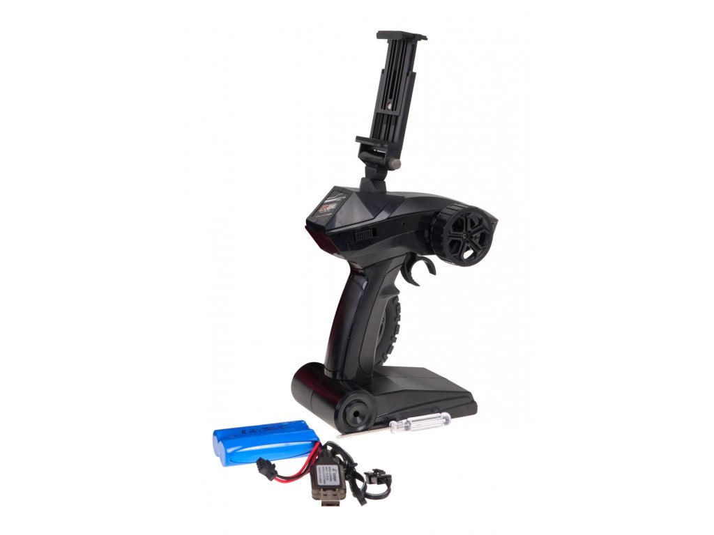 Az off-road távirányítós autó 1:12 méretarányban készül. A távirányító 2,4 GHz-es frekvencián működik, és lehetővé teszi a babakocsi vezérlését minden irányban, azaz jobbra, balra, hátra és előre.