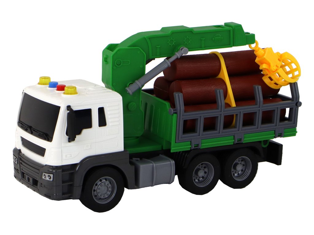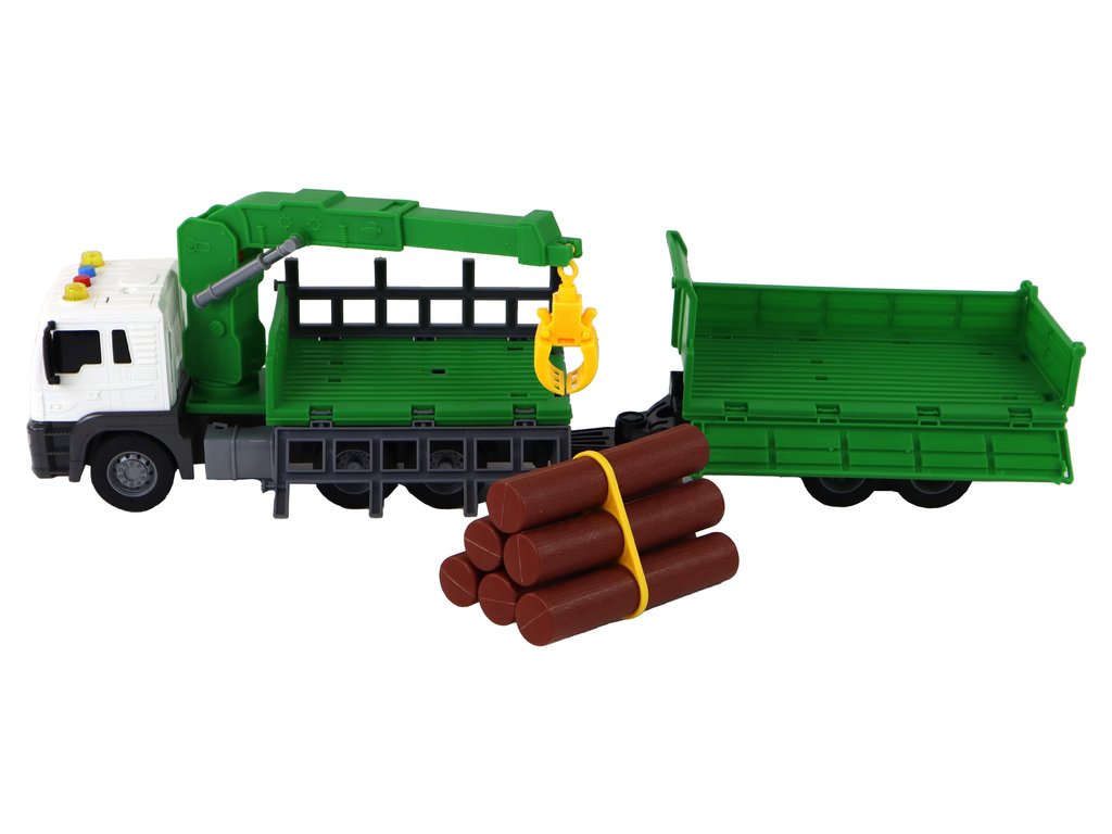A teherautó tetején egy mozgatható karú darut találunk, amely interakciót és kreativitást kölcsönöz a játéknak. A gyermek fát emelhet és süllyeszthet, játszhat fagyűjtési és rakásos jeleneteket. A csomag 6 db fahasábot és egy pótkocsit tartalmaz. A tartós gumiabroncsok biztonságos játékot és stabilitást biztosítanak, ami növeli a játék használatának örömét.