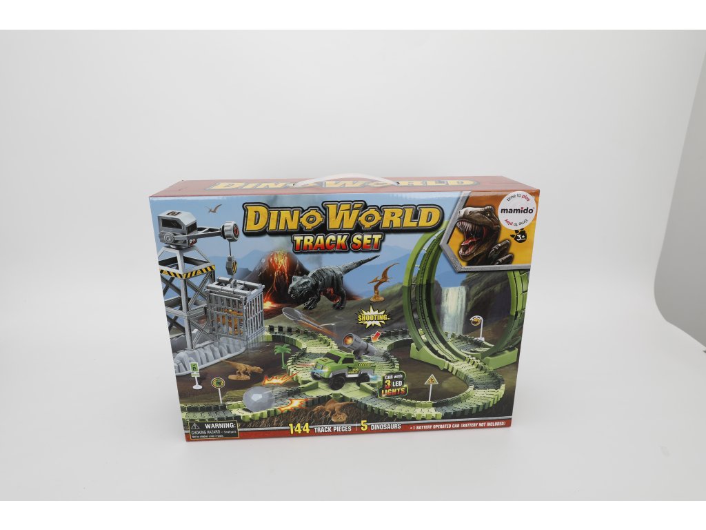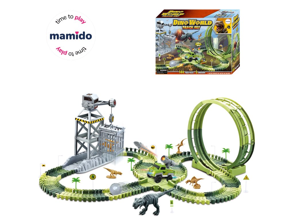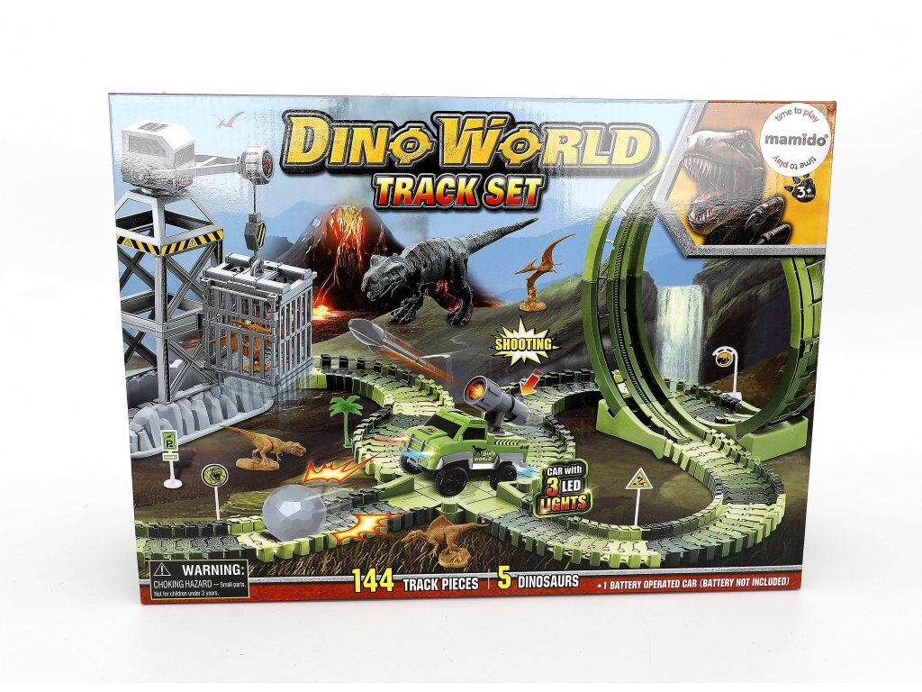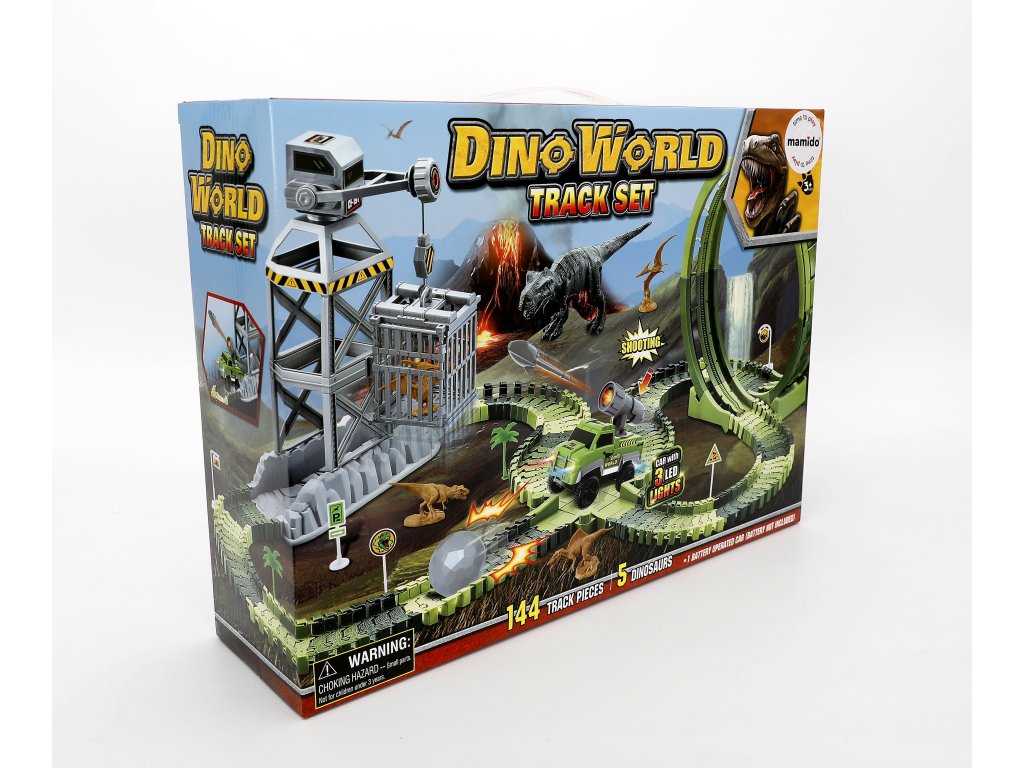 A dinoszauruszok kalandos világa életre kel – egy nagyméretű versenypálya építőkészlet akcióelemekkel, 360°-os hurokkal és LED-es autóval, amely egyenesen a dinoszaurusz pofáján keresztül hajt át a kapun. A rugalmas pályaelemeknek köszönhetően a pálya könnyen alakítható kanyarokká, ugratókká és akadályokká. Tartozik hozzá egy torony is a dinoszauruszok „elfogására“ szolgáló ketreccel, valamint 5 dinoszaurusz a még nagyobb játékélmény érdekében.