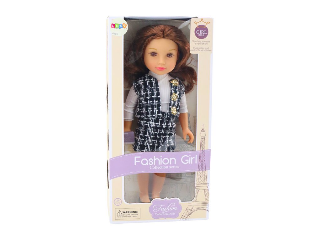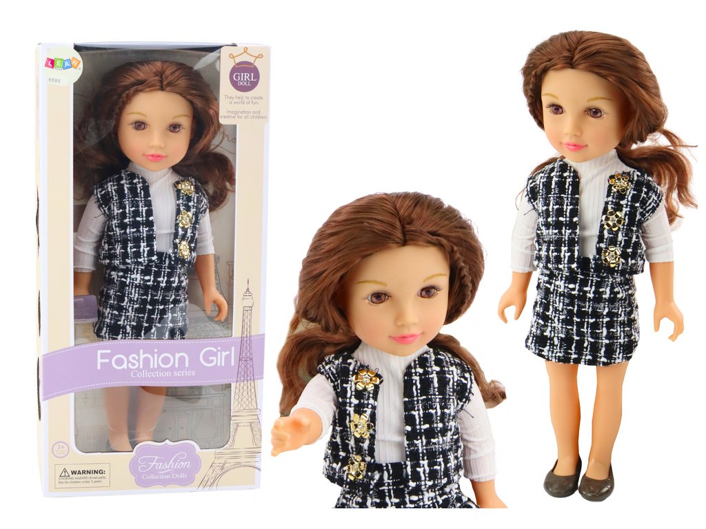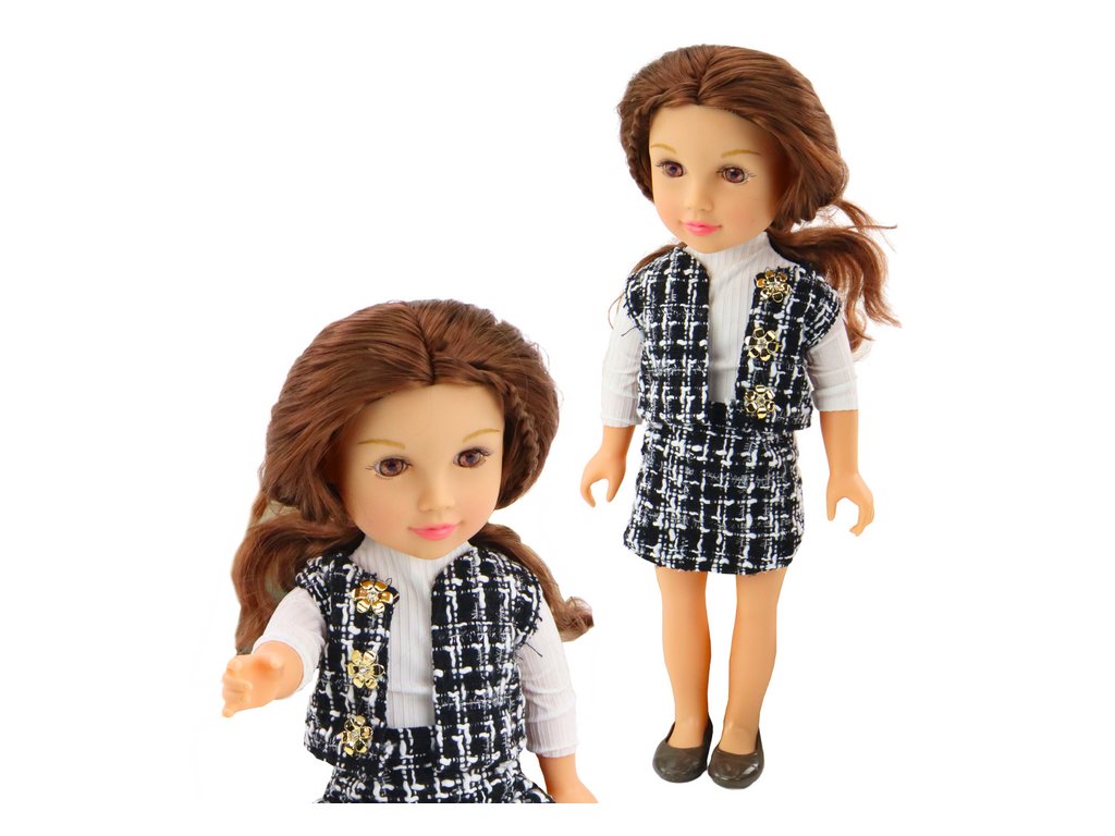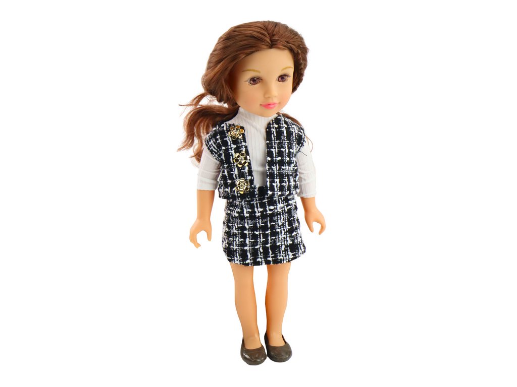 Stílusos fekete-fehér kockás öltönyben, fehér blúzzal, eleganciájával és modern megjelenésével tűnik ki. A funkcionális ruházattal, amelyet a gyerekek könnyen felvehetnek és levehetnek, a baba segíti a kézi készségek és a koordináció fejlesztését, így nagyszerű ajándék lehet minden kis divattervező számára.