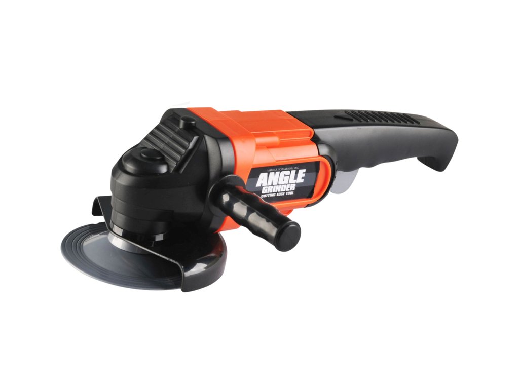 A csiszoló narancssárga, fekete elemekkel, a fogantyún lévő gomb megnyomásával a tárcsa forogni kezd.