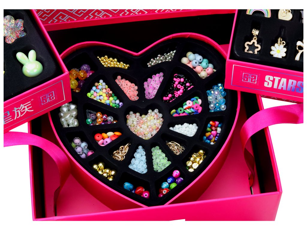 A készlet közepén egy nagy szív található, amelyben különböző színű kis gyöngyök vannak elrejtve, gondosan válogatva, és arra várnak, hogy új ékszerprojektekben felhasználják őket.