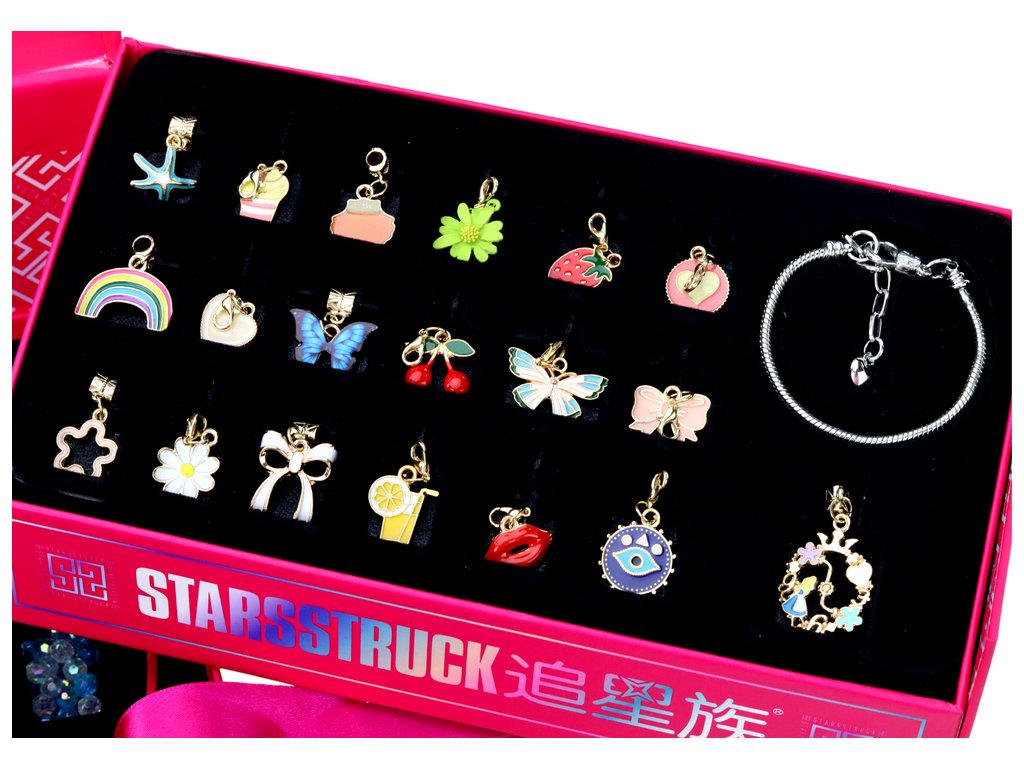 Az első polcon színes, pillangók, virágok és csillagok formájú medálok találhatók, amelyek kreatív kombinációkra és egyedi kompozíciók létrehozására ösztönöznek. A második polcon színes, gyönyörű mintákkal díszített gyöngyök gazdag választékát, valamint virágok és masnik formájú nagyméretű medálokat talál, amelyek varázslatot kölcsönöznek minden ékszernek.