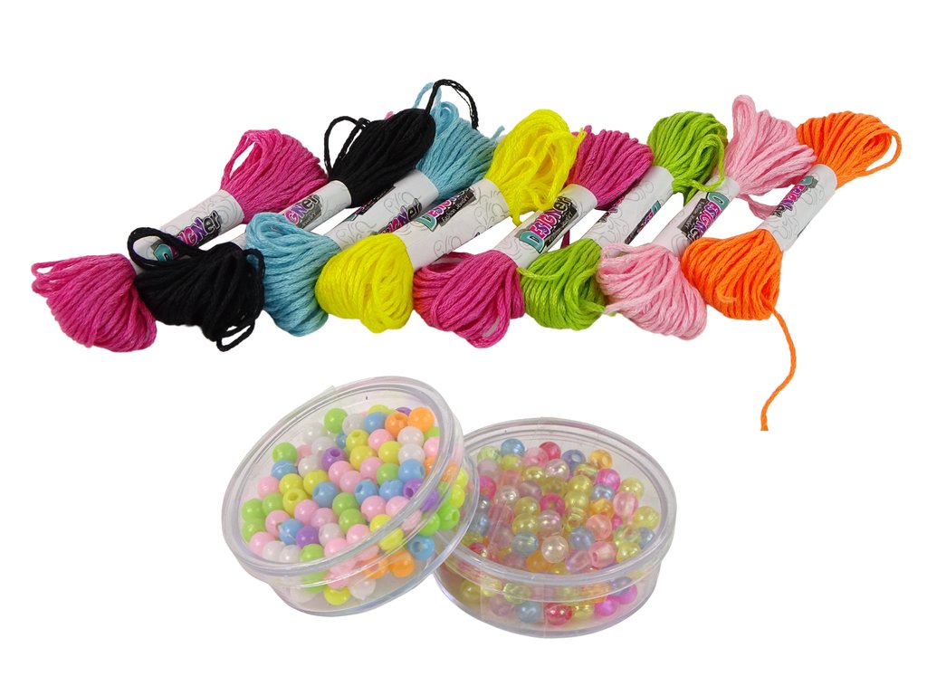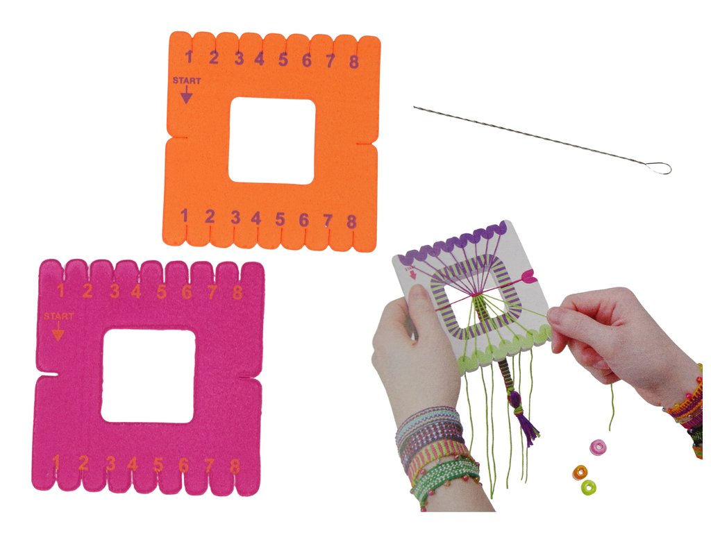 A karkötőkészítő készlet leírásokat és képeket tartalmaz, amelyek lépésről lépésre elmagyarázzák a karkötők elkészítését. A speciális tűk megkönnyítik a kötött minták létrehozását, a gyöngyök díszítik, a vattagolyók pedig színt adnak.