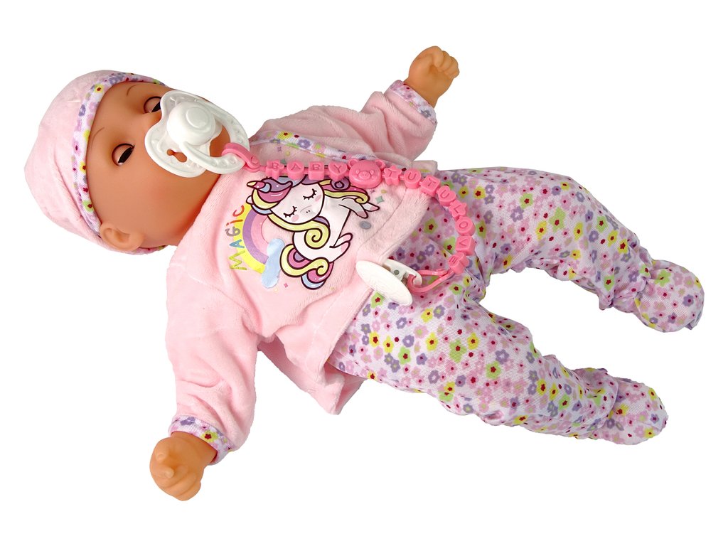 A baba gyönyörű rózsaszín virágos pizsamába van öltözve, középen egyszarvúval. A babának mozgatható karjai és lábai, valamint feje van.