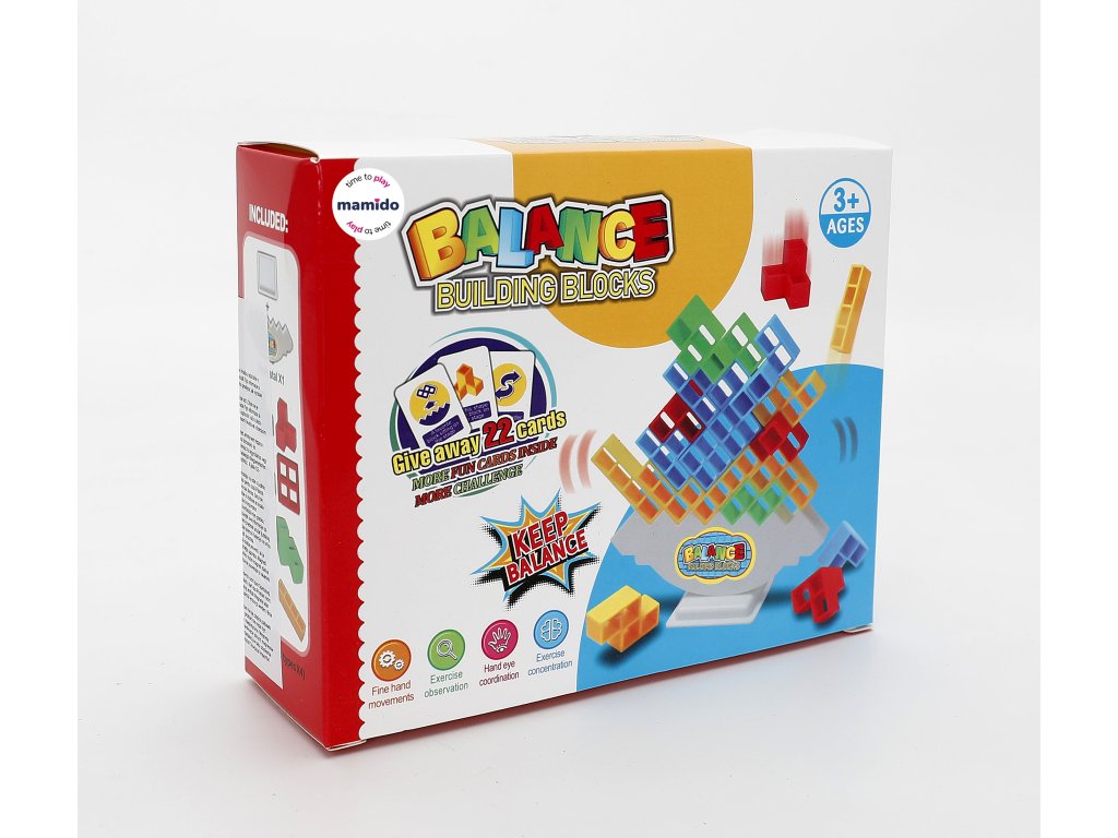 - A csomag tartalma: stabil alap, színes blokkok, 22 játékkártya