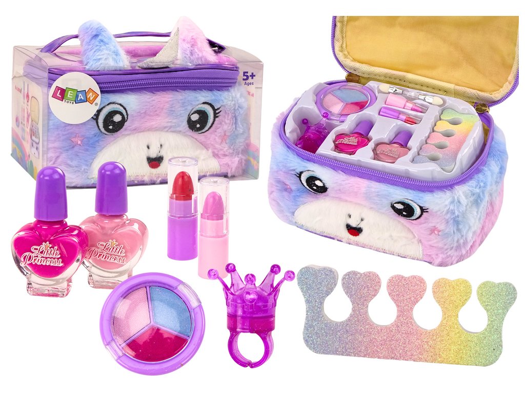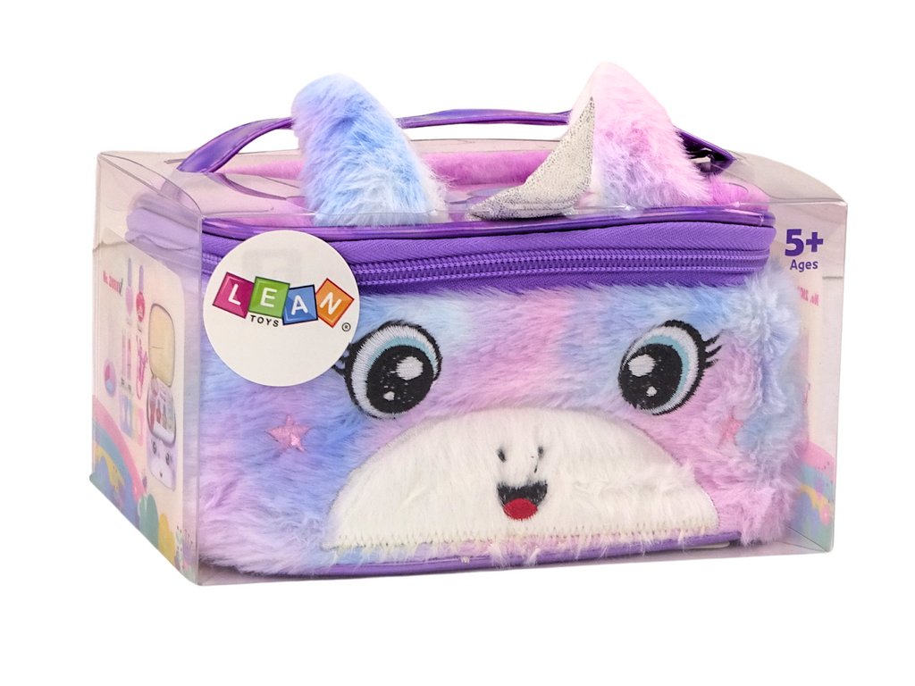 Egy kozmetikai szett egy imádnivaló kozmetikai táskában minden kis smink- és szépségkedvelő álma. A puha plüss anyagból készült, pasztell rózsaszín és kék árnyalatú, egyszarvú motívumú kozmetikai táska nem csak praktikus, de varázslatos hely a kozmetikumok tárolására is.