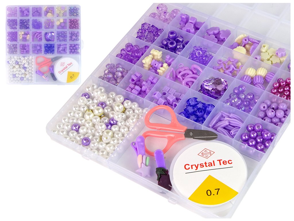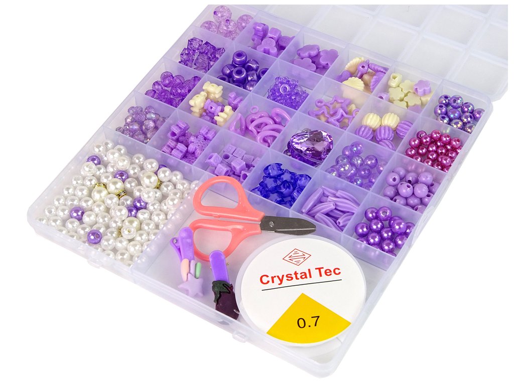A készlet mindent tartalmaz, ami az ékszerek készítéséhez szükséges. A nagy szervezőben 25 különböző gyöngy található a lila szín különböző árnyalataiban, a gyöngyök és gombostűk sem hiányoznak majd.
